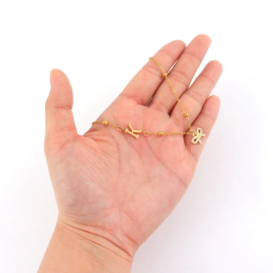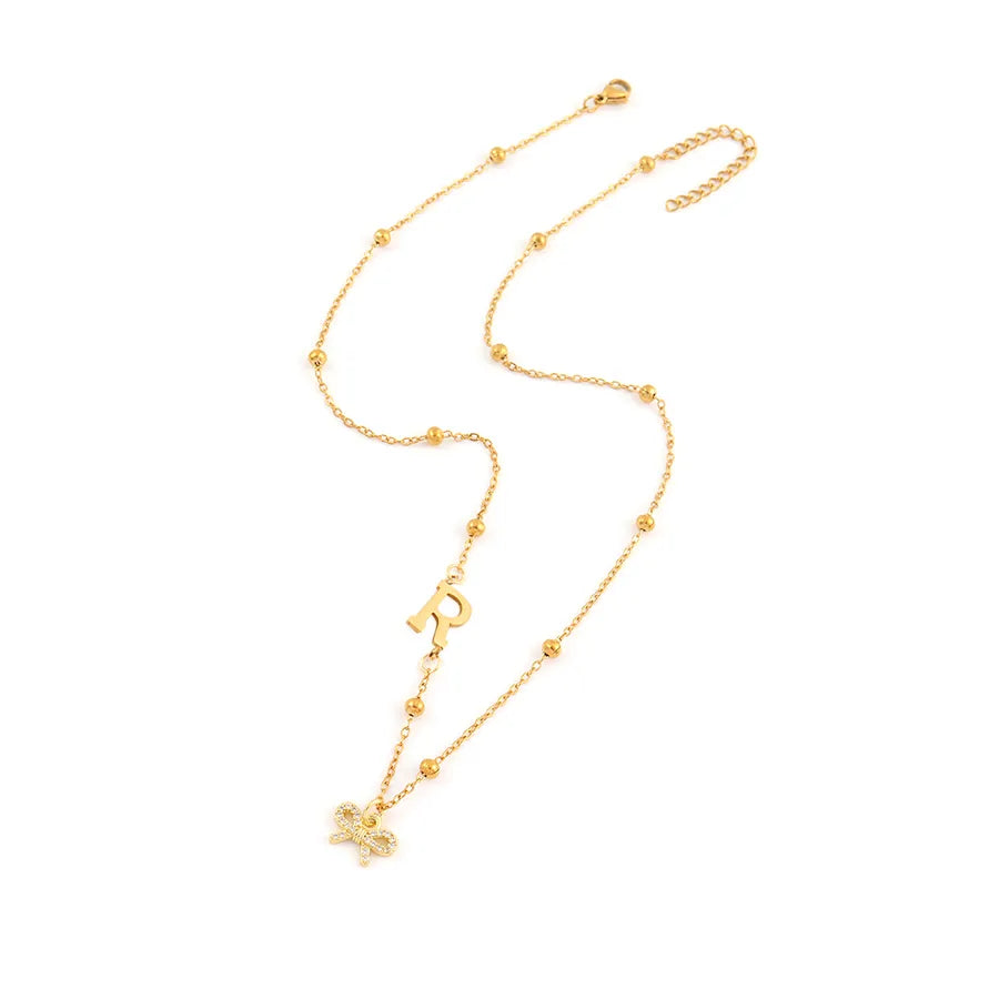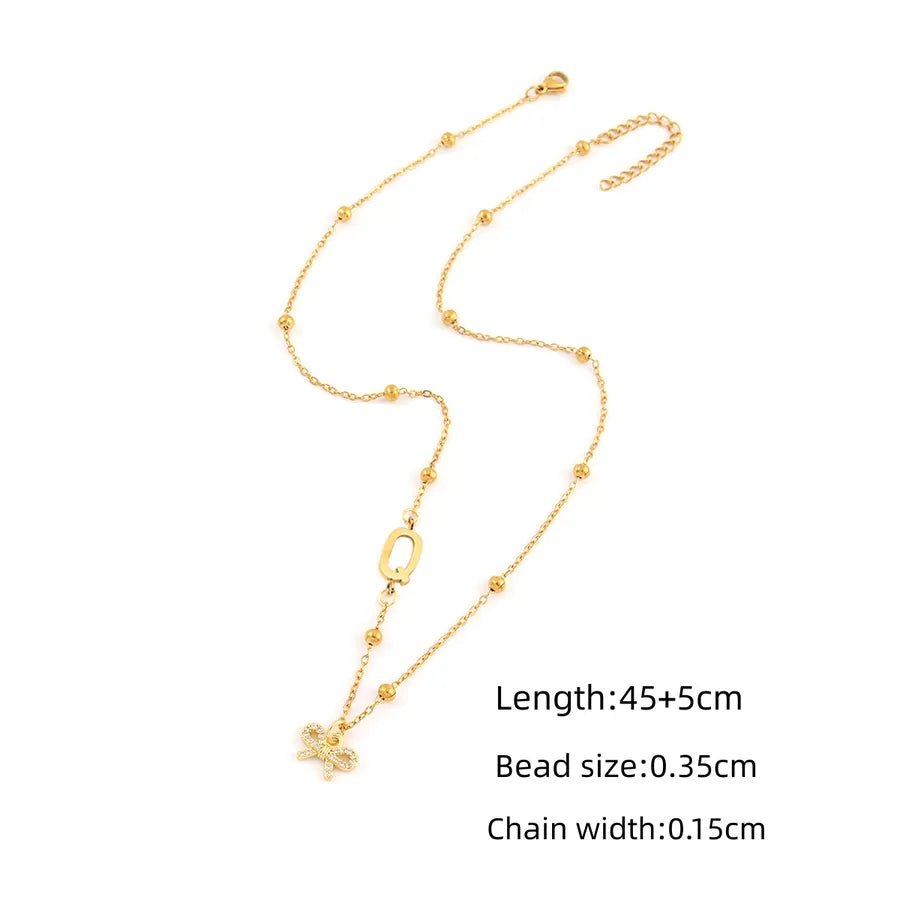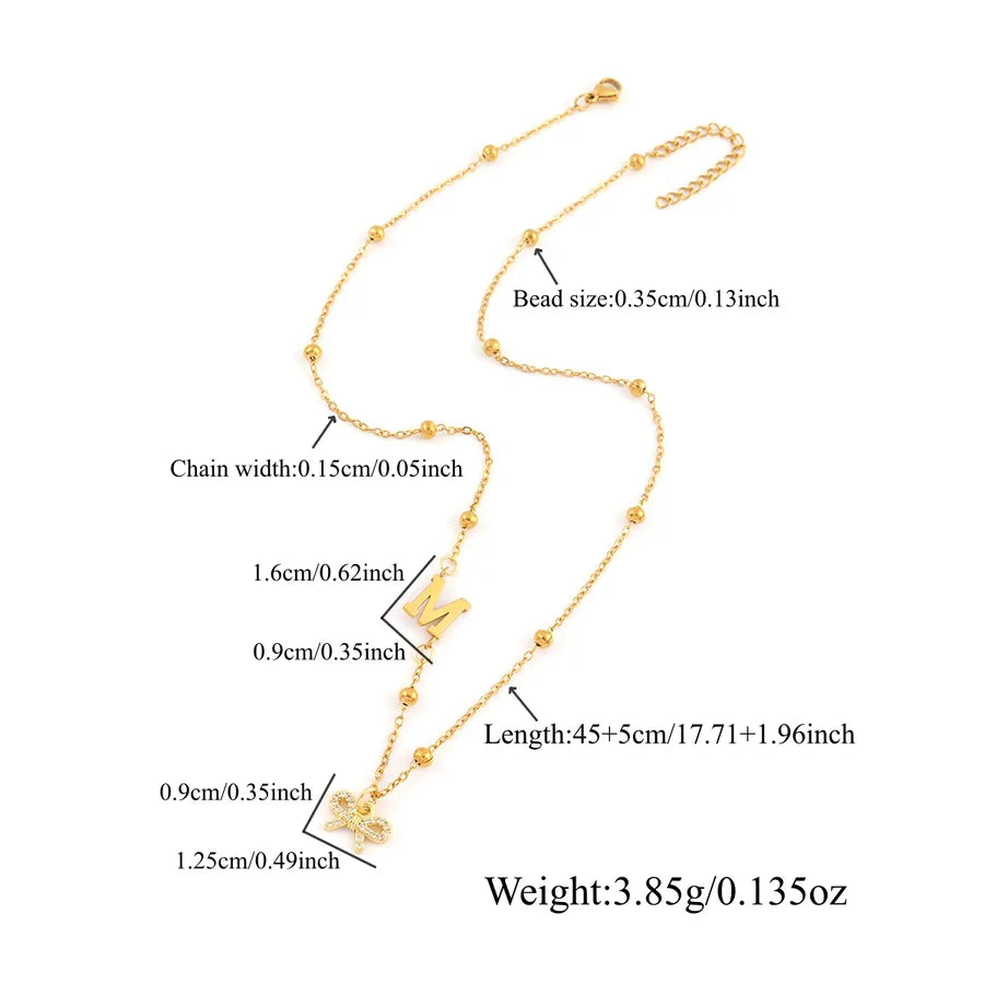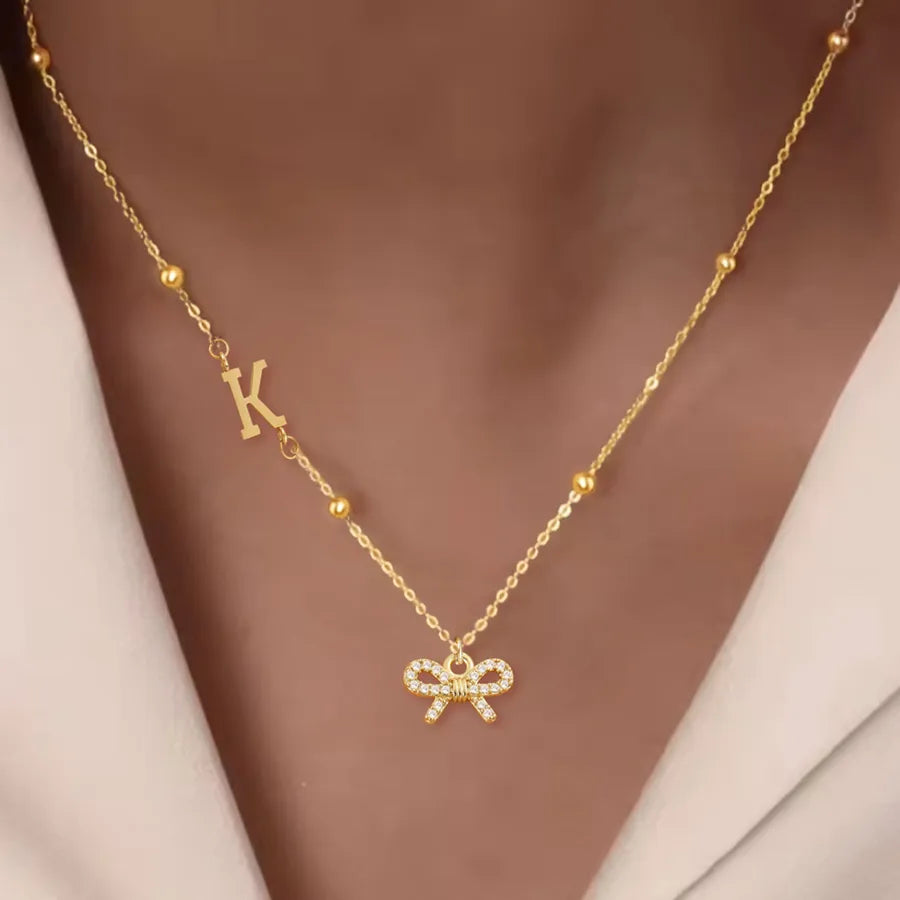 Classic Initial Micro Pave Zircon Bowknot 18K Gold Plated Pendant 201 Stainless Steel Ball Chain Women's Necklace