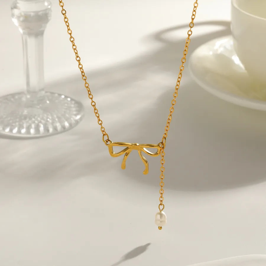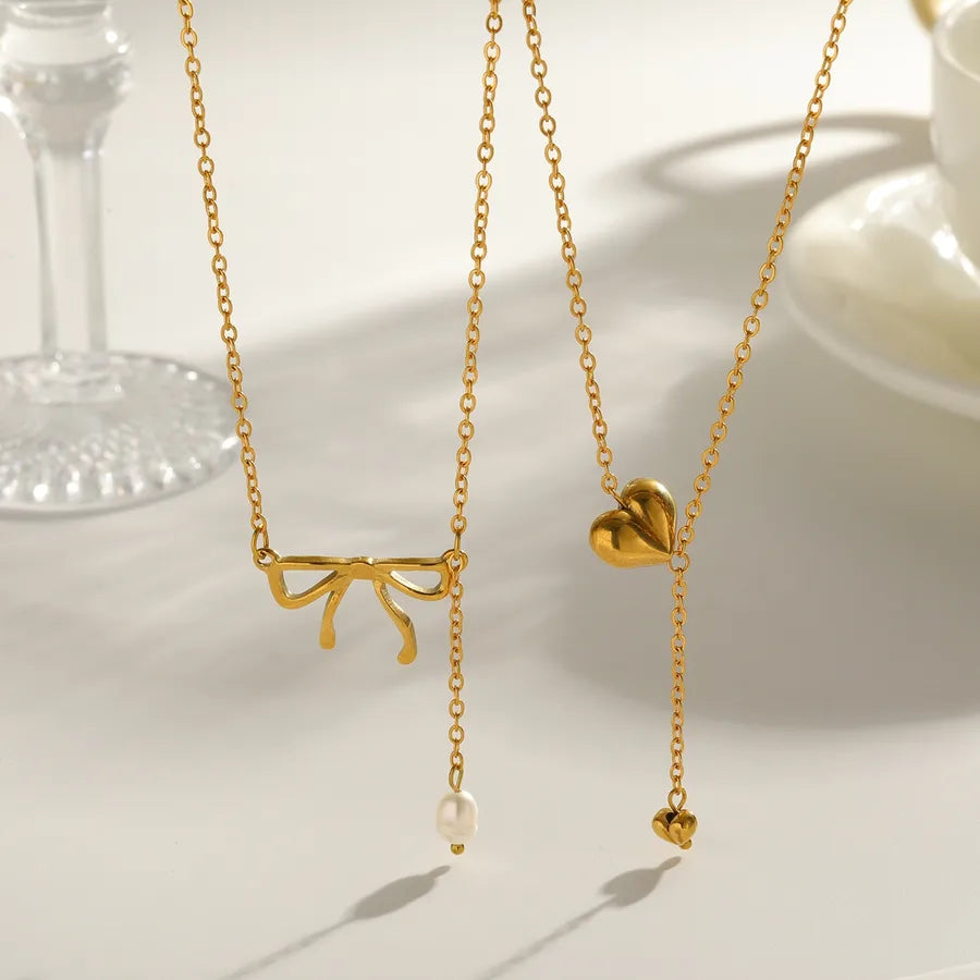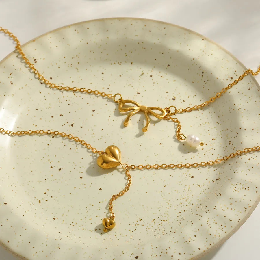 Vacuum Electroplating (In Furnace) Plated 18K Real Gold Heart-shaped Bowknot 304 Stainless Steel Freshwater Pearl Cute British Style New Version Electroplated Lobster Clasp Necklace