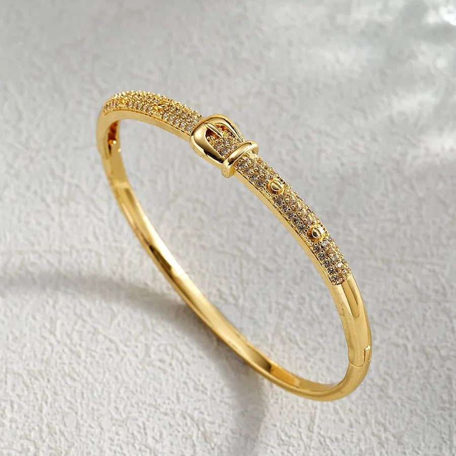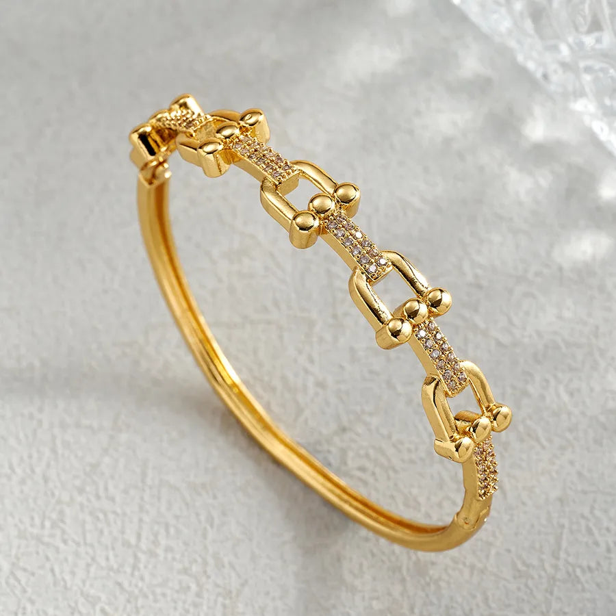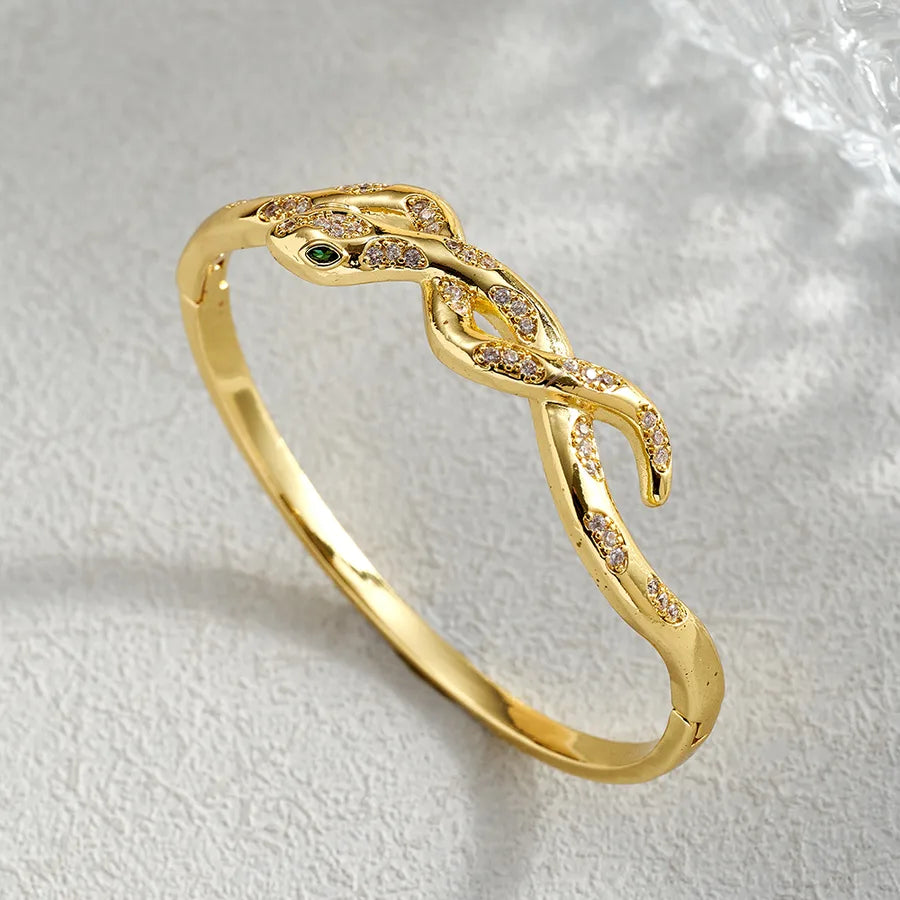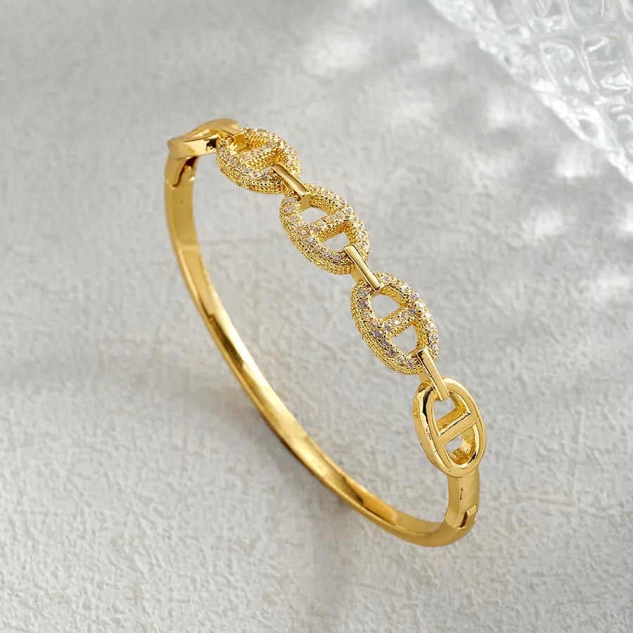 Classic Fashion Copper Micro Inlaid Zircon Geometric Oval Snake Shape Openable 18K Gold Plated Bracelet