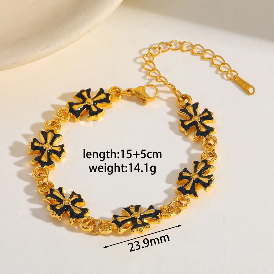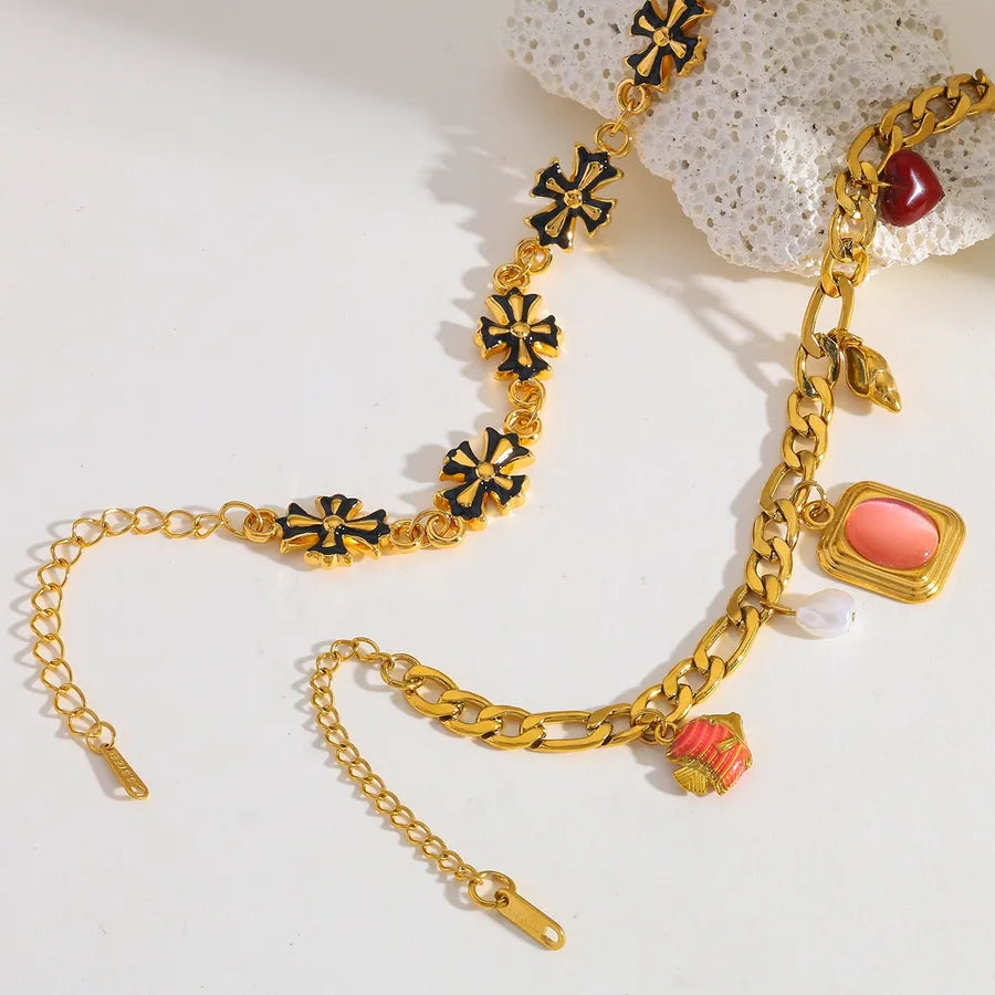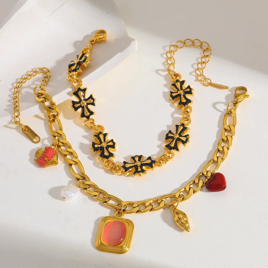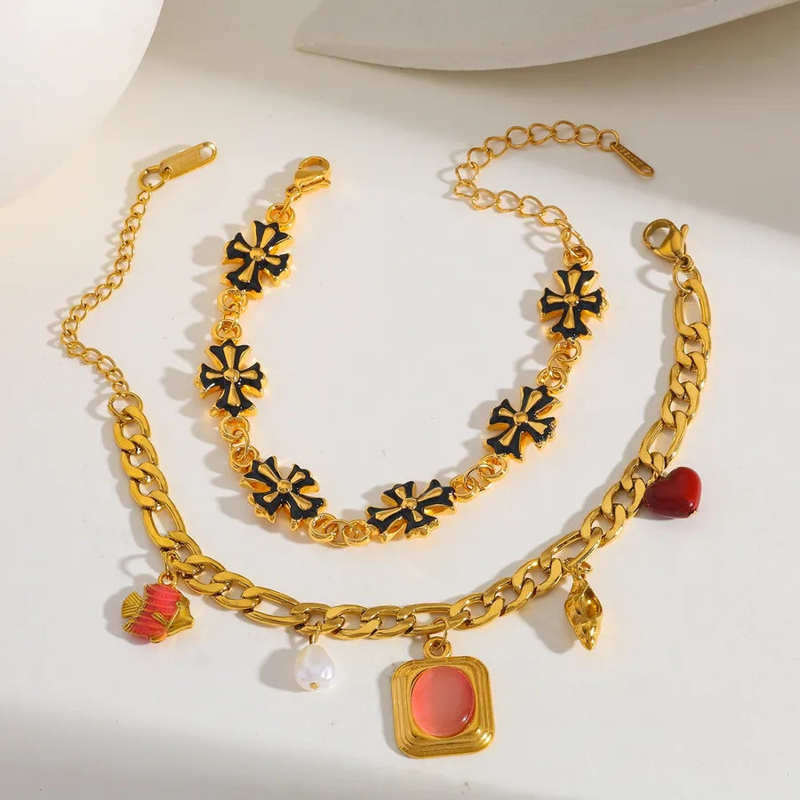 18K Gold Plated 304 Stainless Steel Vacuum Electroplating (In Furnace) Artificial Pearl Zircon Cross Square Conch Oil Drop Electroplating Cuban Chain/Curb Chain Handmade Chain Multi Pendant Bracelet for Women Fish
