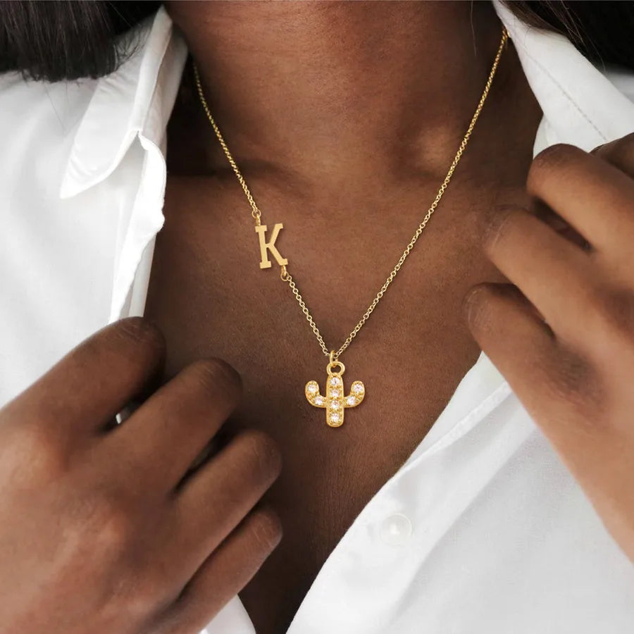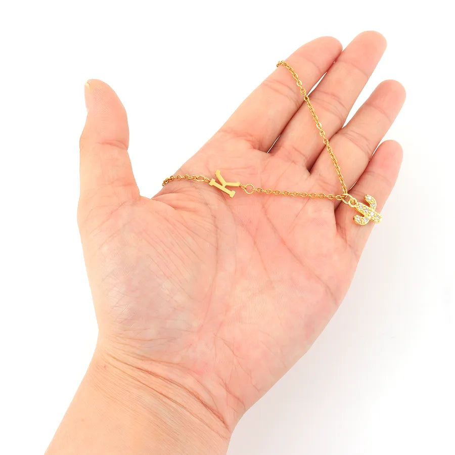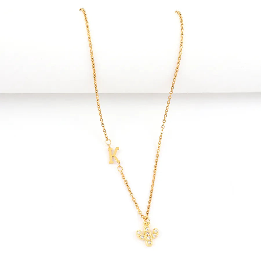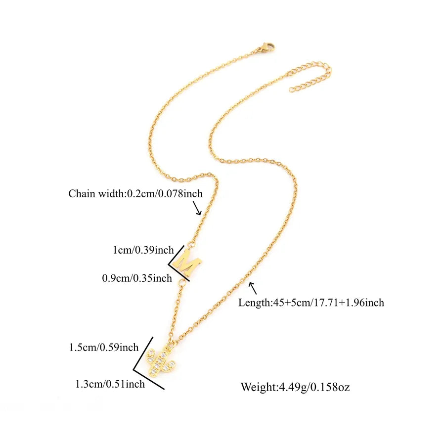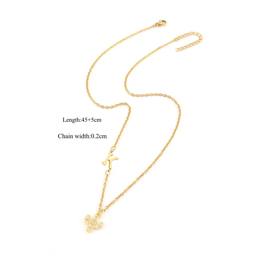 Micro Pave Zircon Cactus Letter/18K Gold Plated Initial Pendant Gold 201 Stainless Steel Chain Women's Necklace