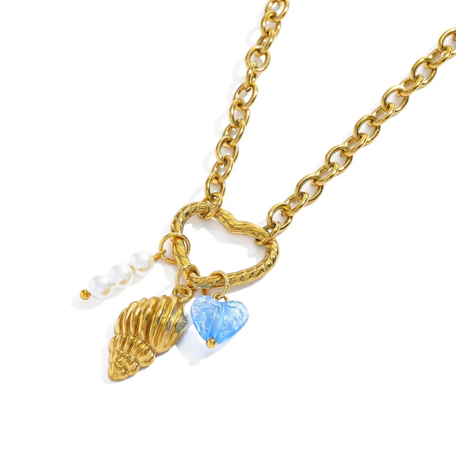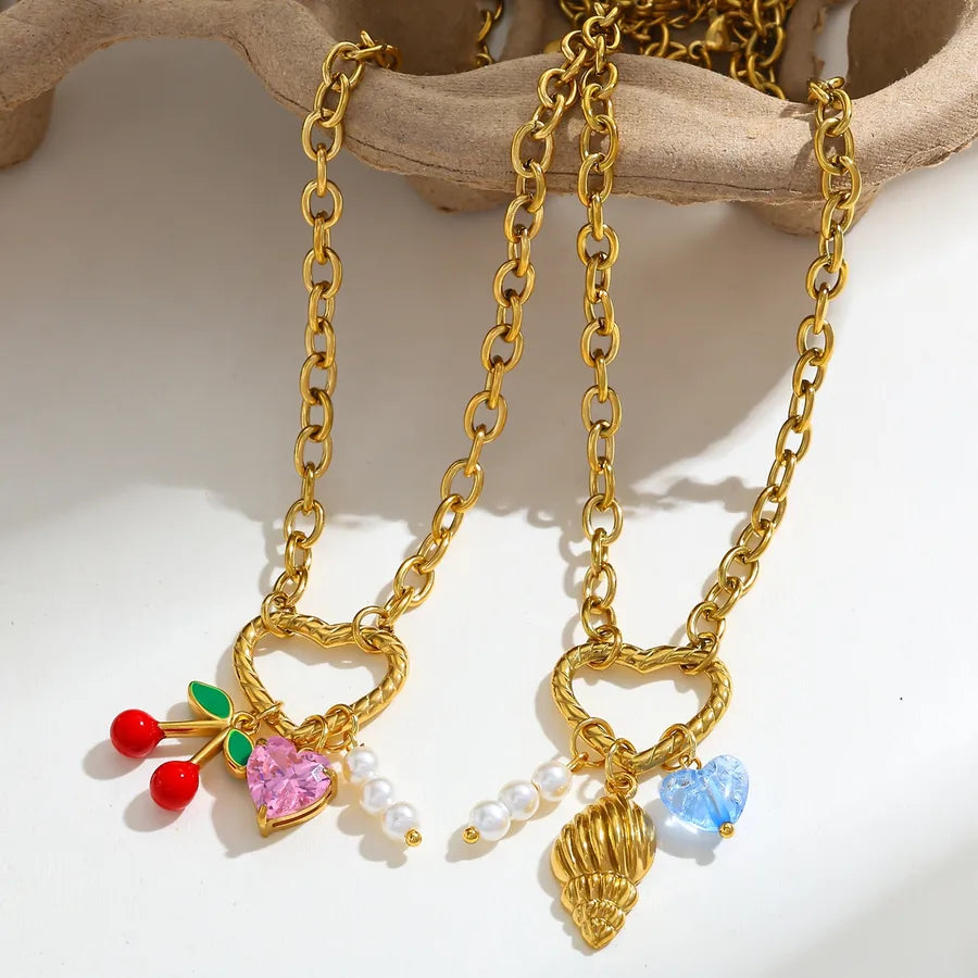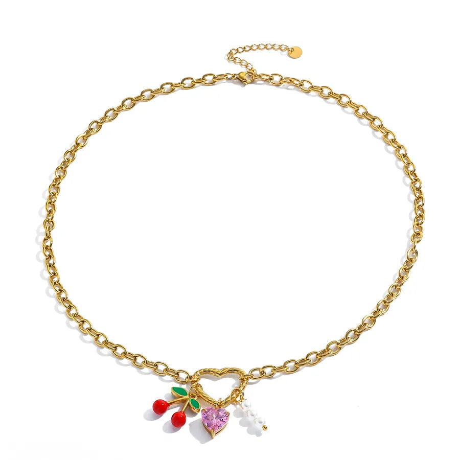 Casual 18K Gold Plated Stainless Steel Fake Pearl Heart Cherry Pendant Necklace Elegant Weekend Indoor Daily Date Selfie Jewelry