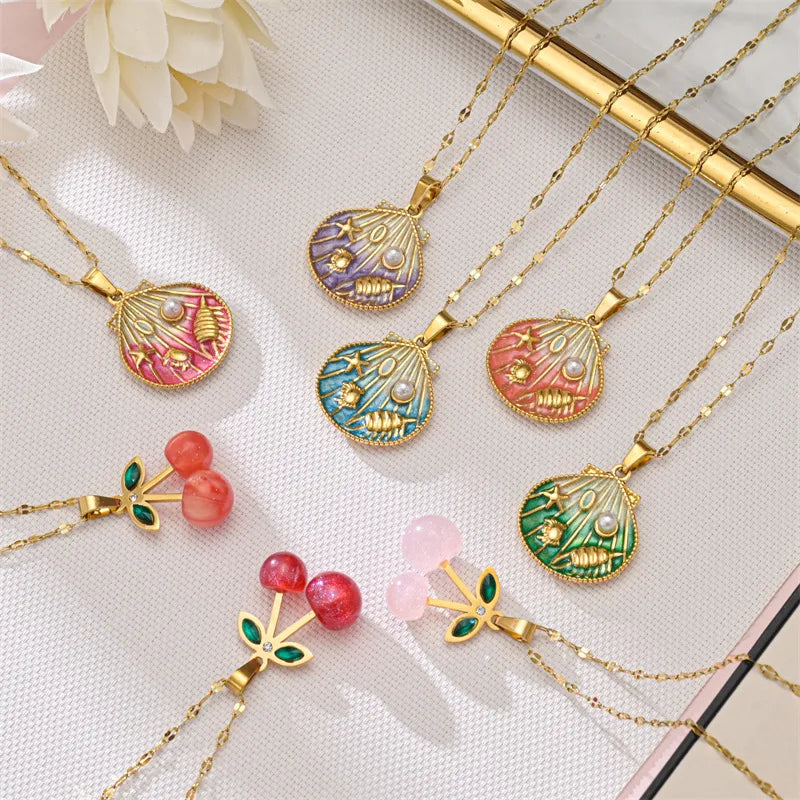 Handmade Stainless Steel Gradient Oil Drop Pendant Necklace Simple Style Jewelry Accessory Cherry Decoration Part