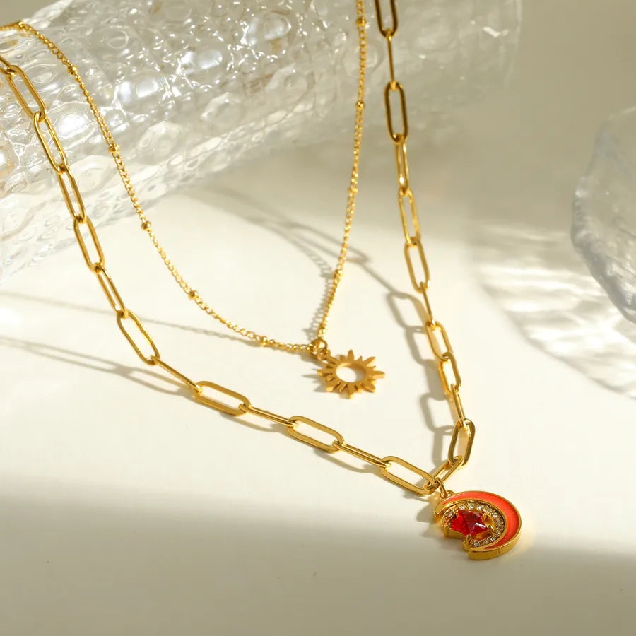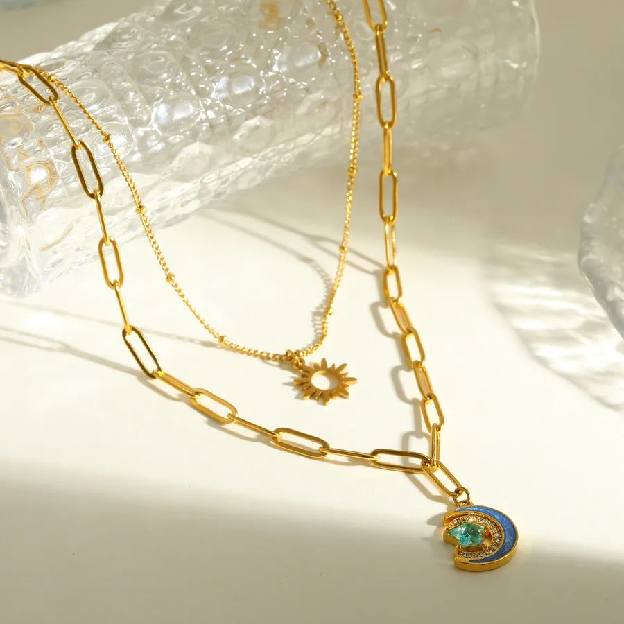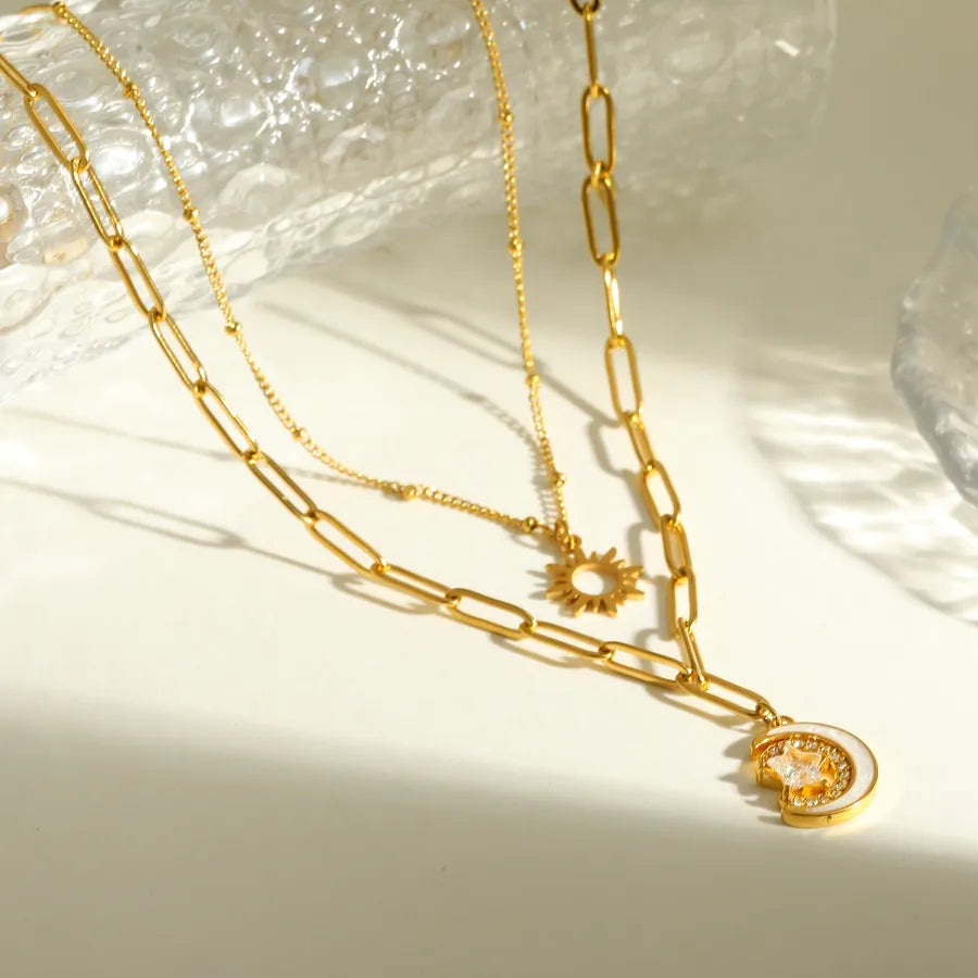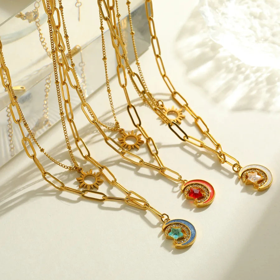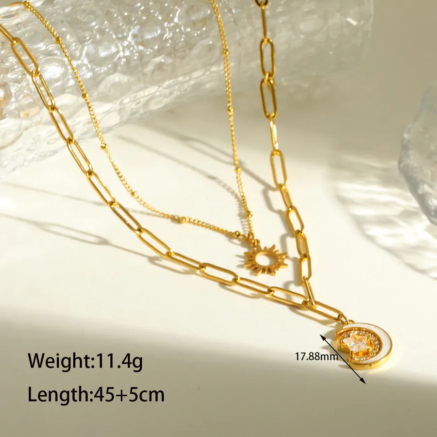 18K Gold Plated 201 Stainless Steel Vacuum Electroplating (In Furnace) Sun Moon Paperclip Chain Simple Style Pendant Necklace for Women
