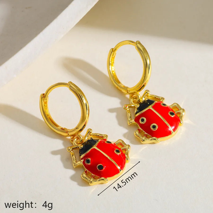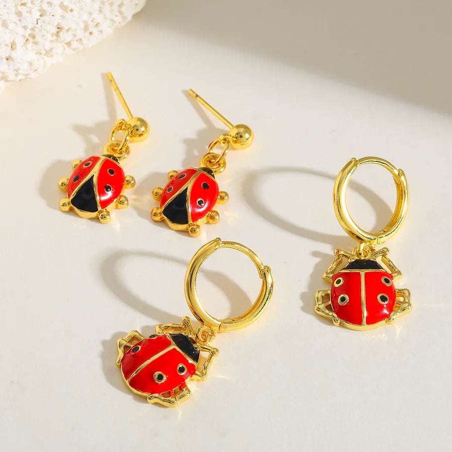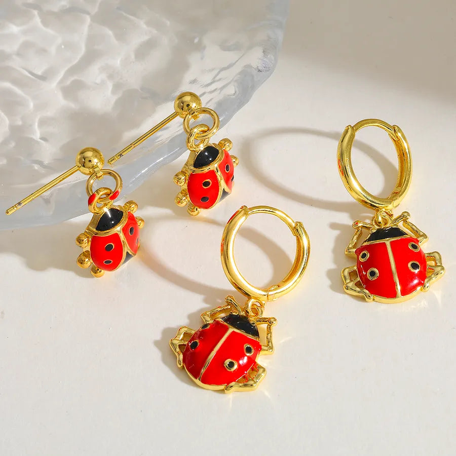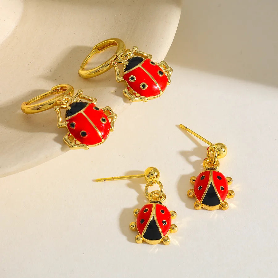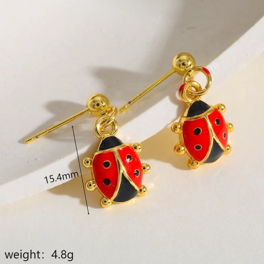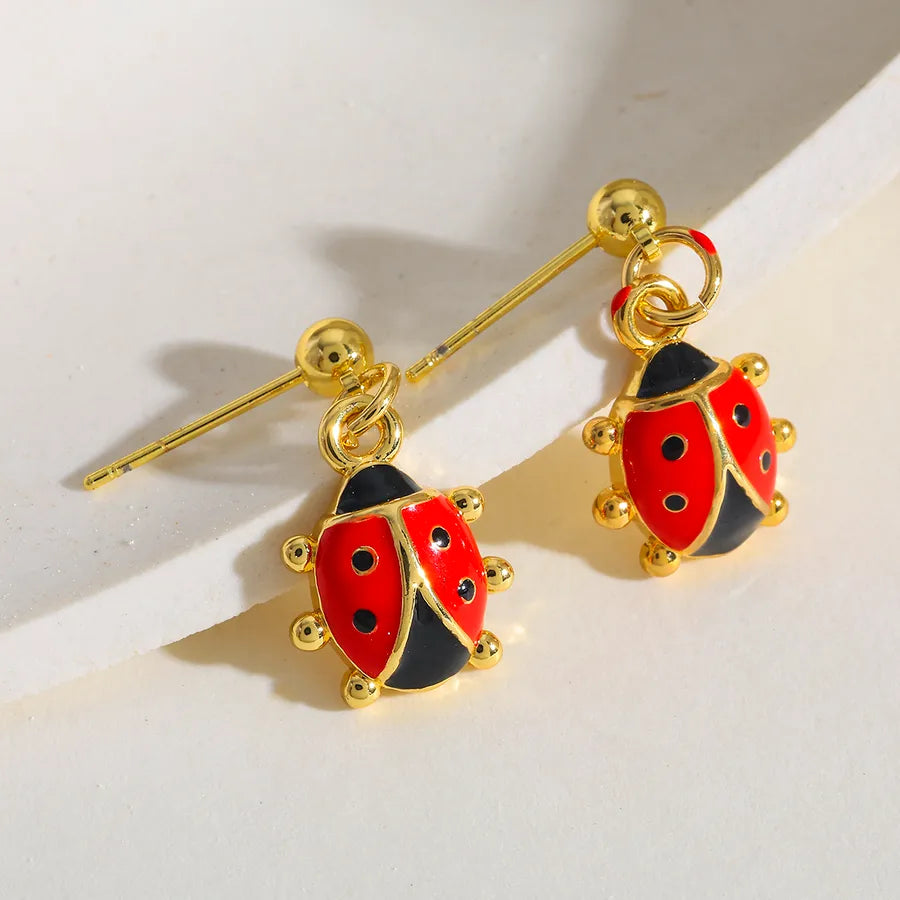 18K Gold Plated Copper Water Plated Ladybug Oil Drop Casual Simple Style Shiny Red Earrings for Women