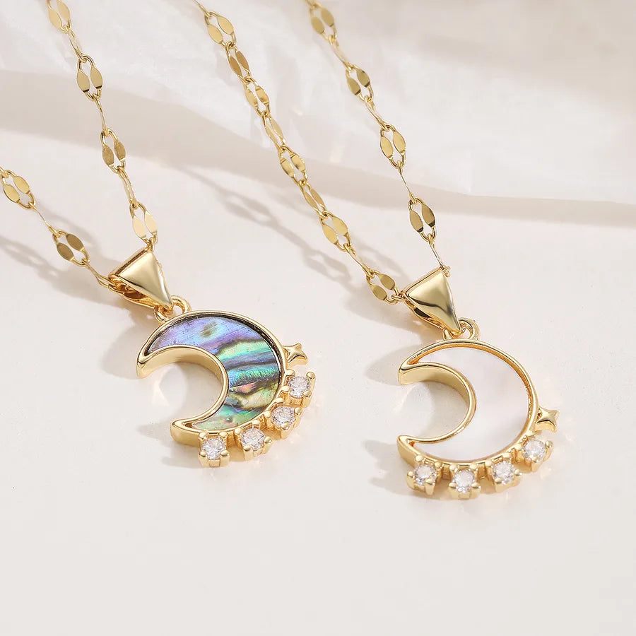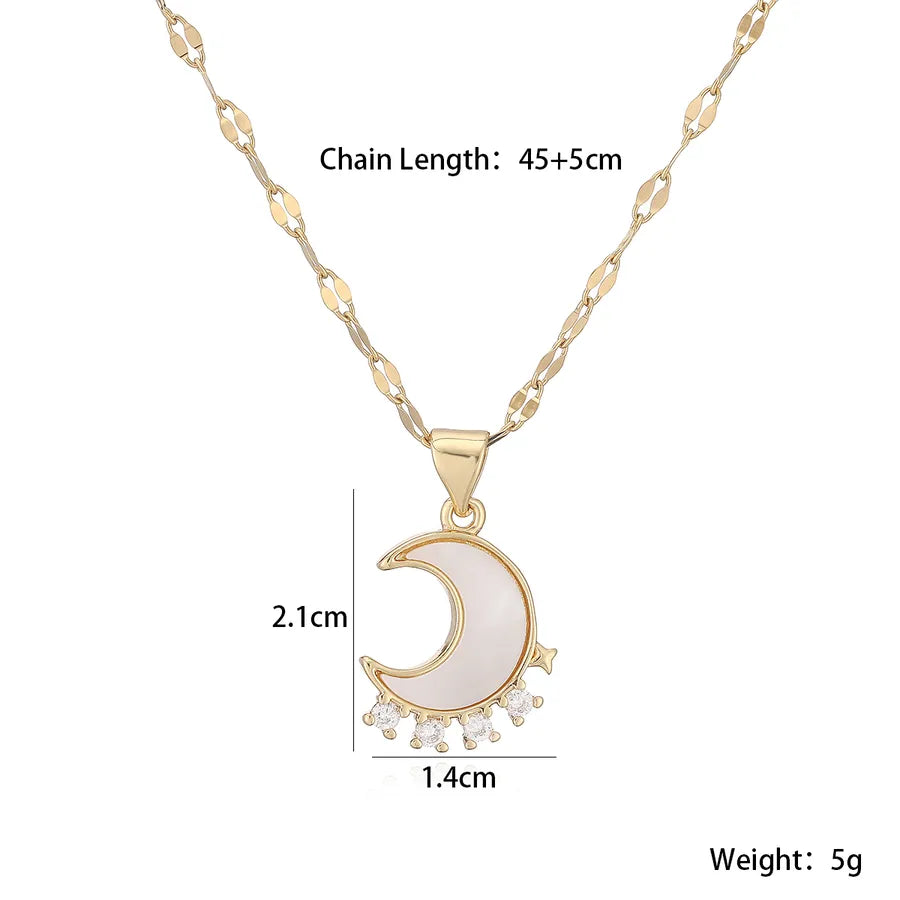 18K Gold Plated Copper Zircon Inlaid Shell Moon Pendant Necklace for Women Simple Style