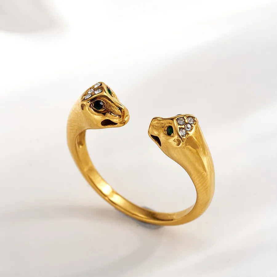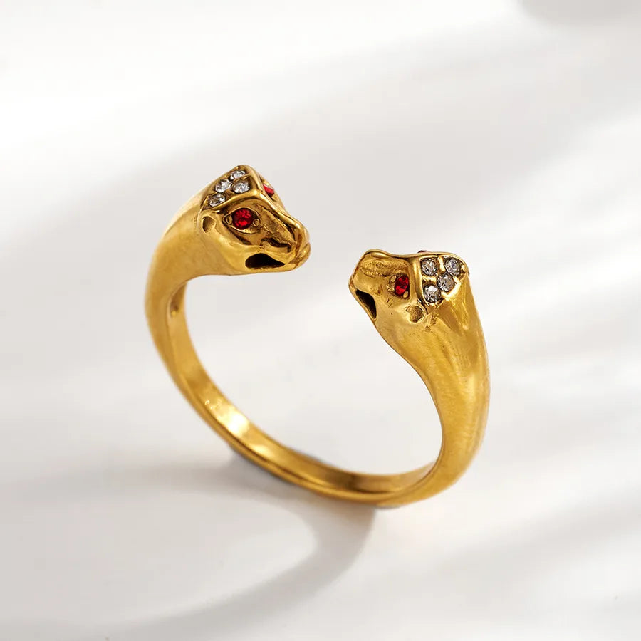 Fashion 18K Gold Plated 304 Stainless Steel Colorful Rhinestone Animal 3D Double-Head Open Ring