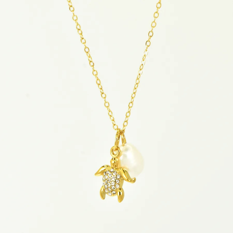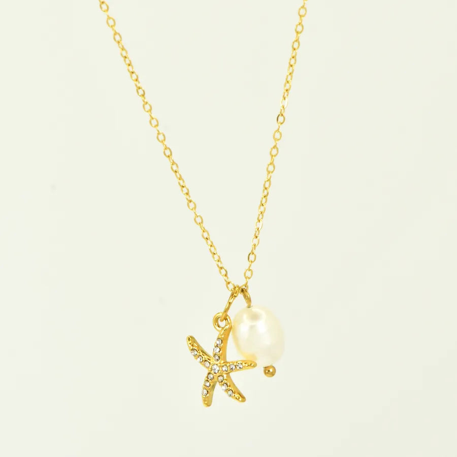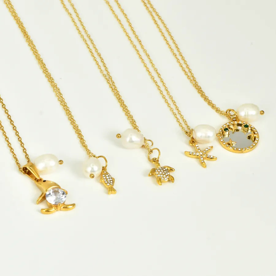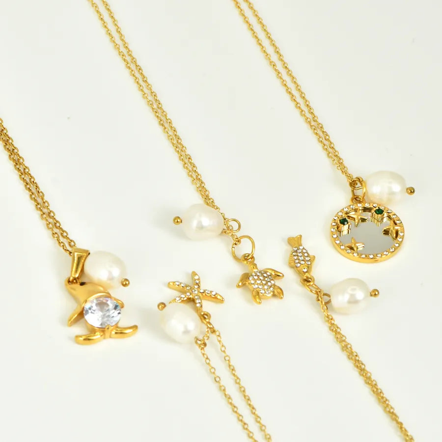 Ocean Style Zircon Inlaid Freshwater Pearl 304 Stainless Steel 18K Gold Plated Vacuum Electroplated Waterproof Non-Fading Women's Necklace