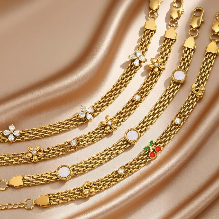 Women's 201 Stainless Steel Mesh Strap Five-Leaf Flower White Zircon Bracelet Vacuum Electroplated 18K Real Gold