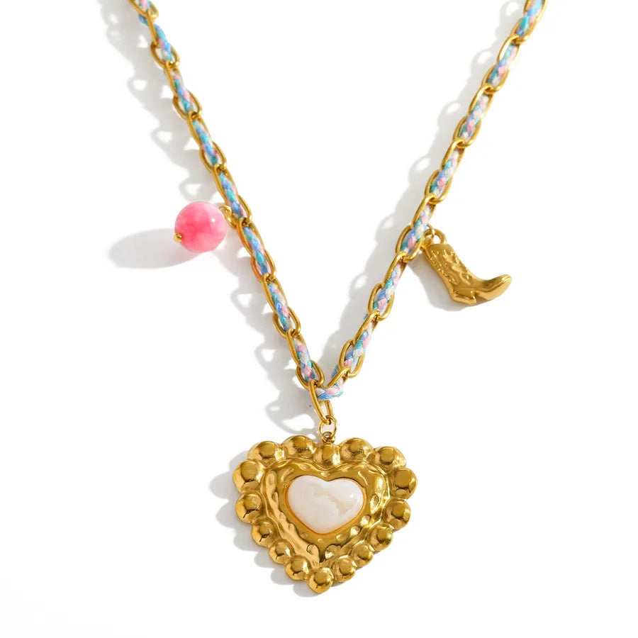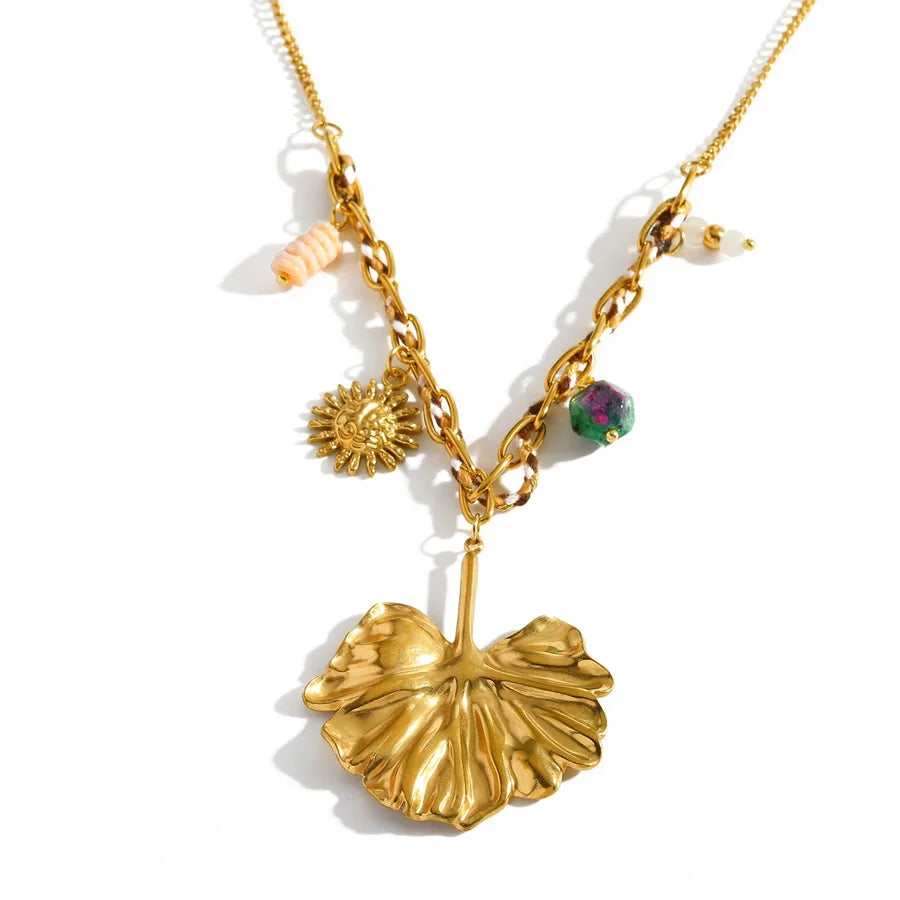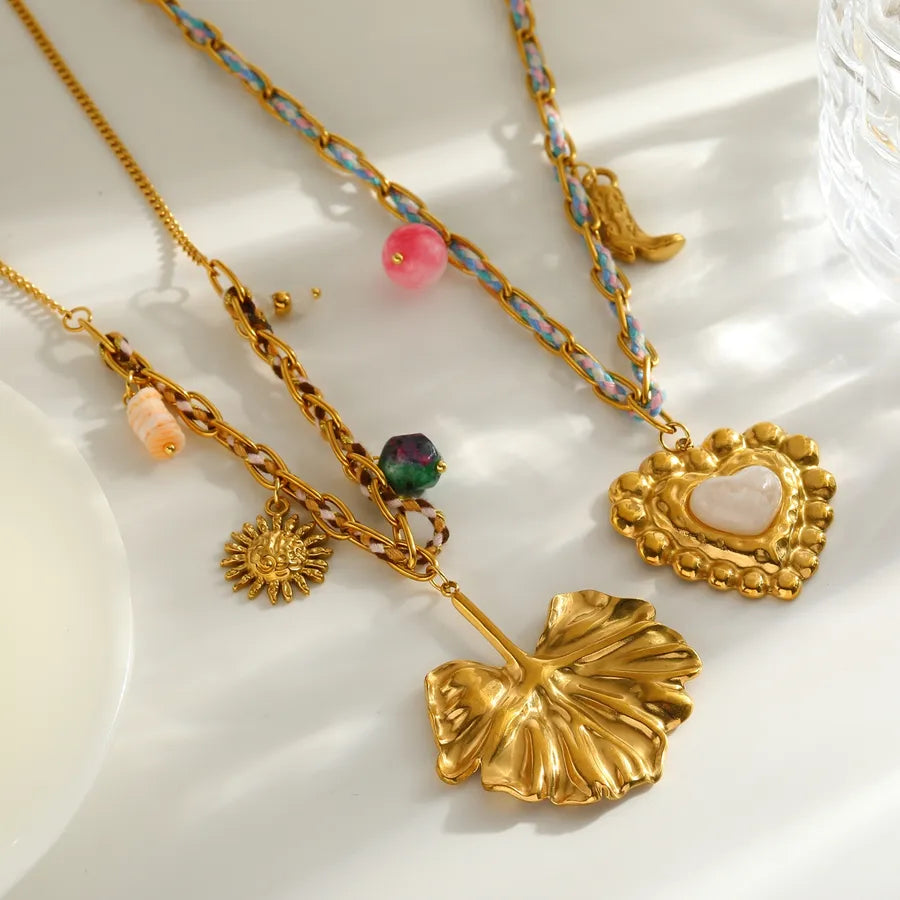 Elegant Gold-Plated Stainless Steel Resin Heart Leaf Pendant Necklace Cotton Thread Chain Simple Casual Jewelry For Women