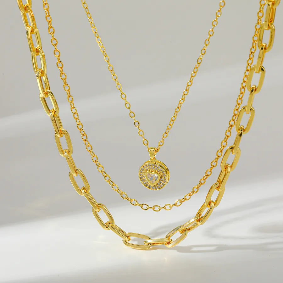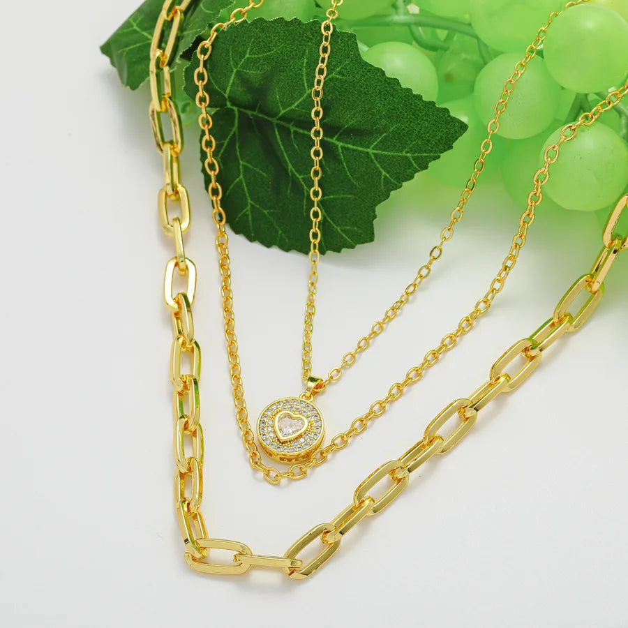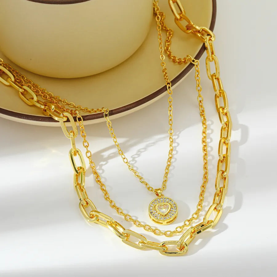 Elegant Round Pendant Necklace With Embedded Zirconium Stone Copper Plated 14K Gold Layered Heart Pattern Women's Jewelry