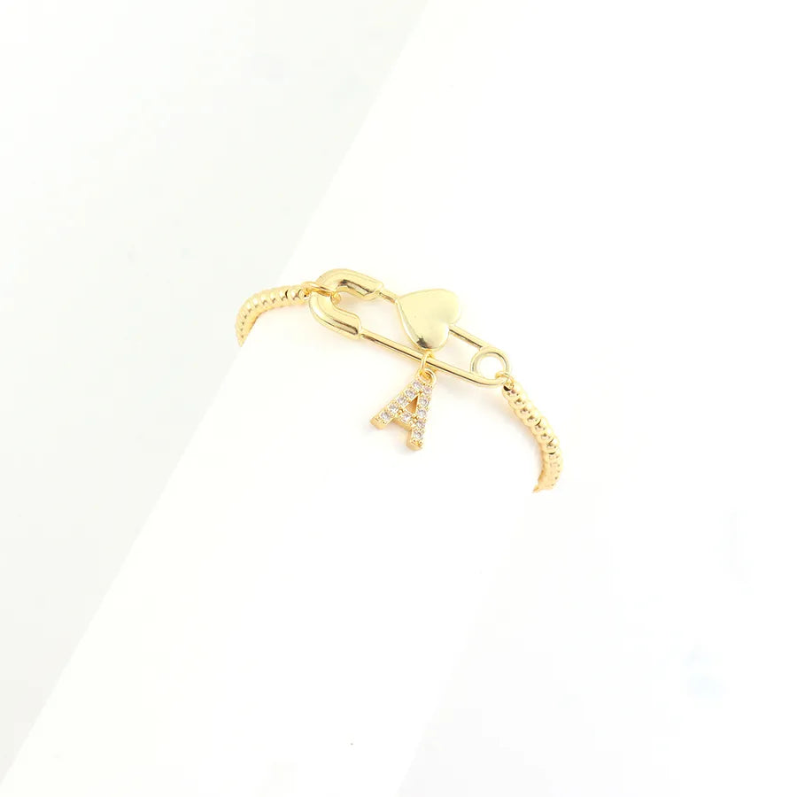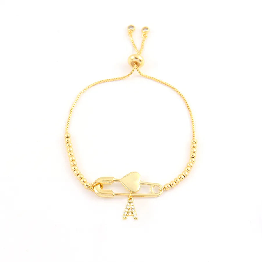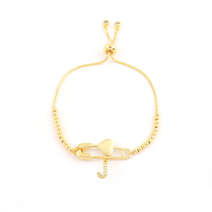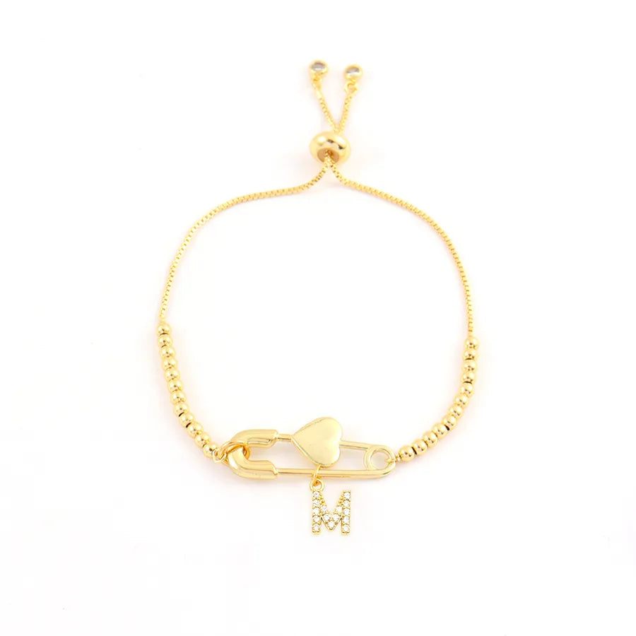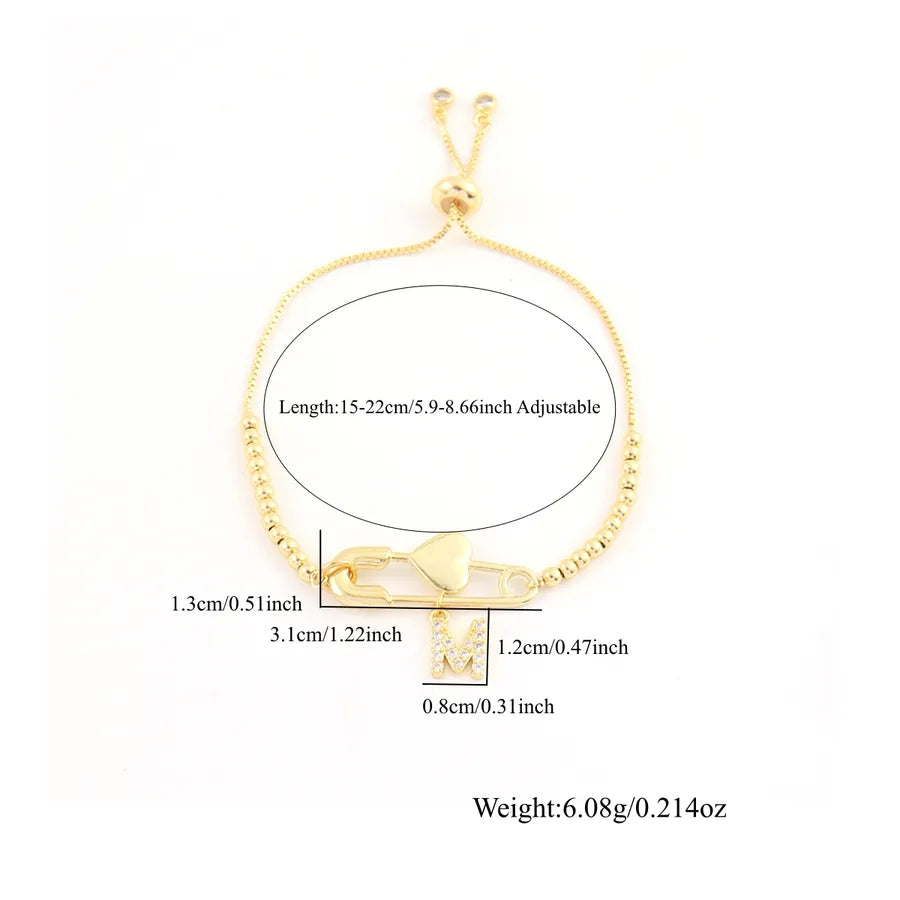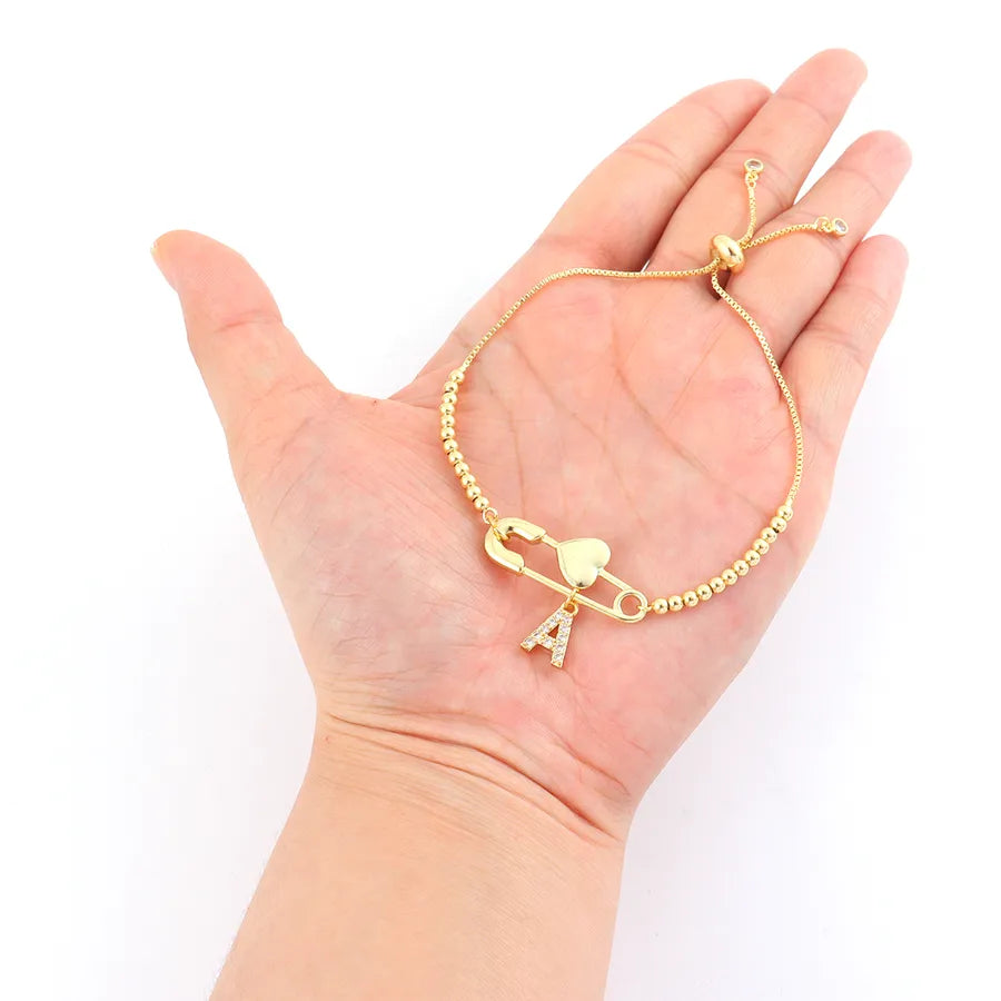 Fashion Classic Micro Pave Zircon Initial Heart Pin Vacuum Electroplated 18K Real Gold Copper Adjustable Women's Bracelet