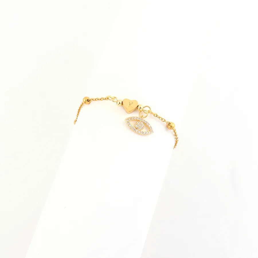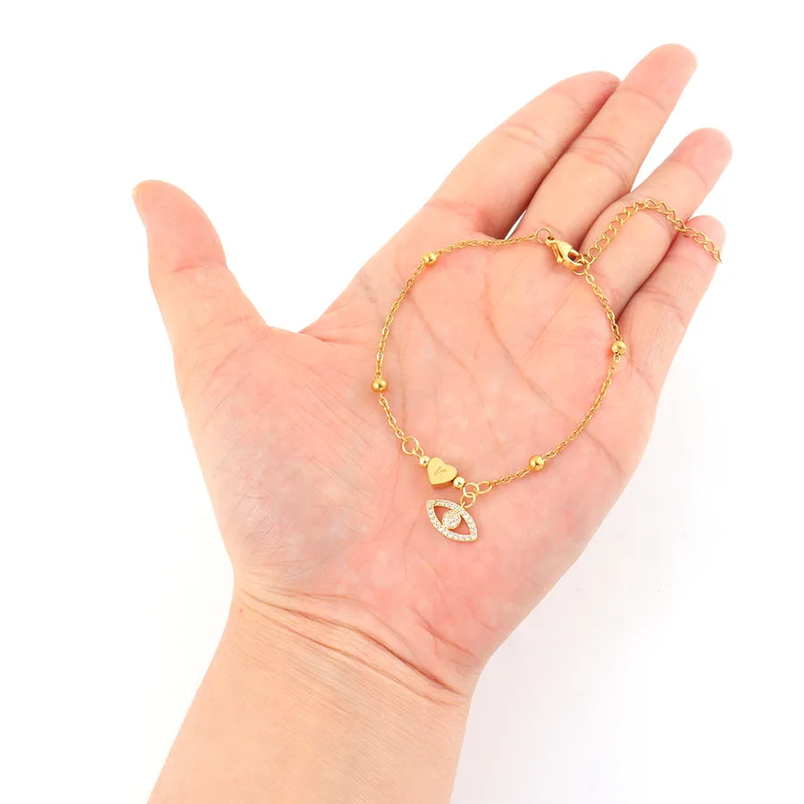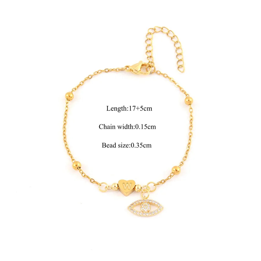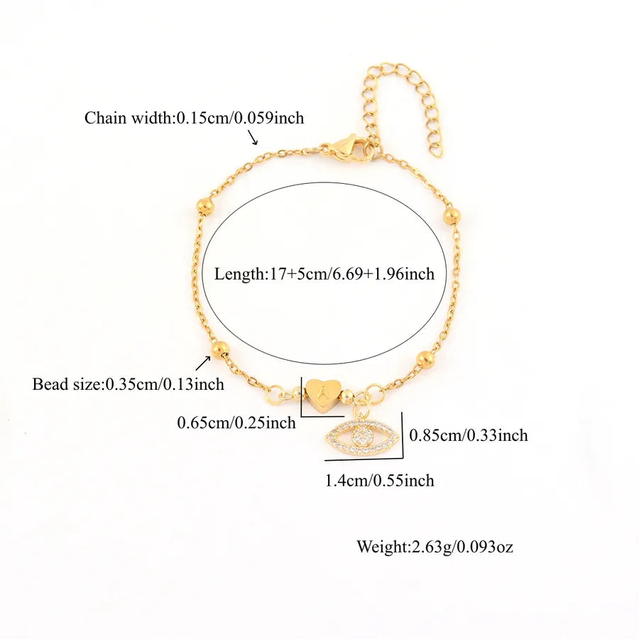 Personalized Casual Micro Pave Zircon Devil's Eye Heart Initial Gold 201 Stainless Steel Ball Chain Women's Bracelet Vacuum Electroplated 18K Real Gold Lobster Clasp Simple Style