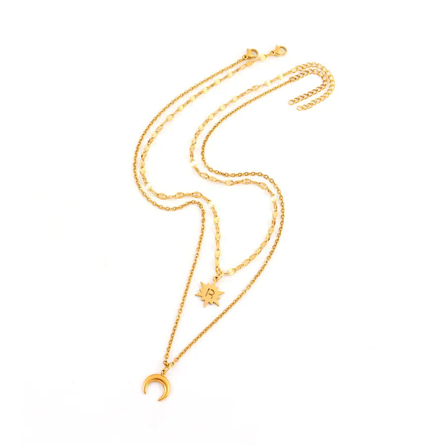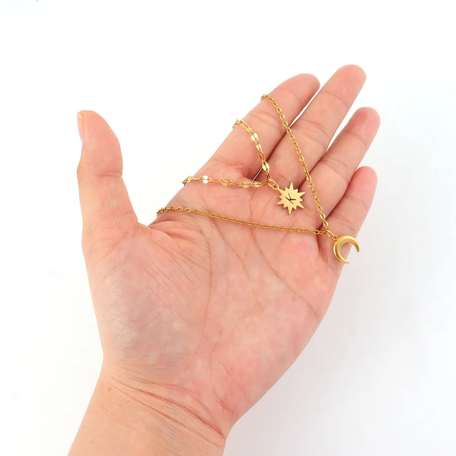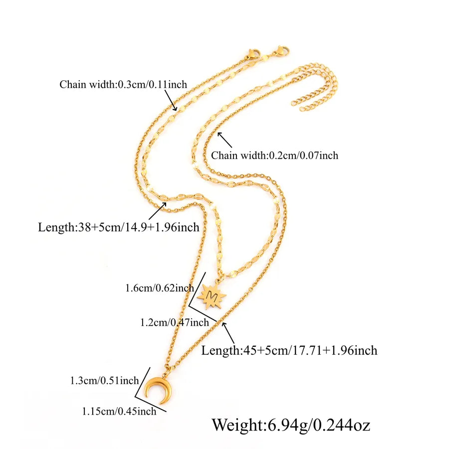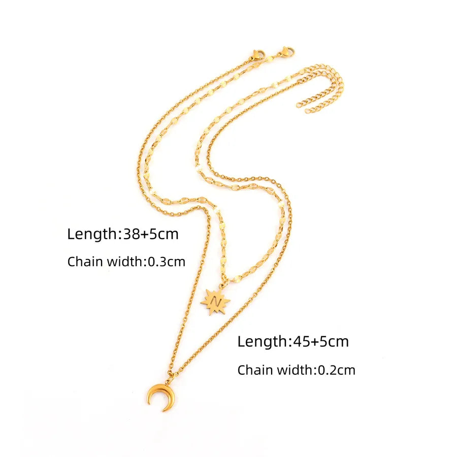 2 Pieces/Set Romantic Fashion Sun Initial Moon Pendant Stainless Steel Chain Necklace Multi-layer Chain Women's Necklace Set