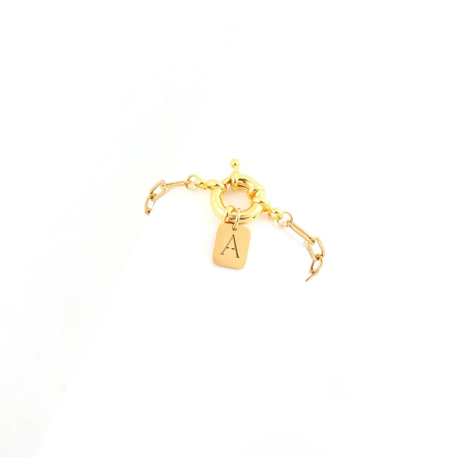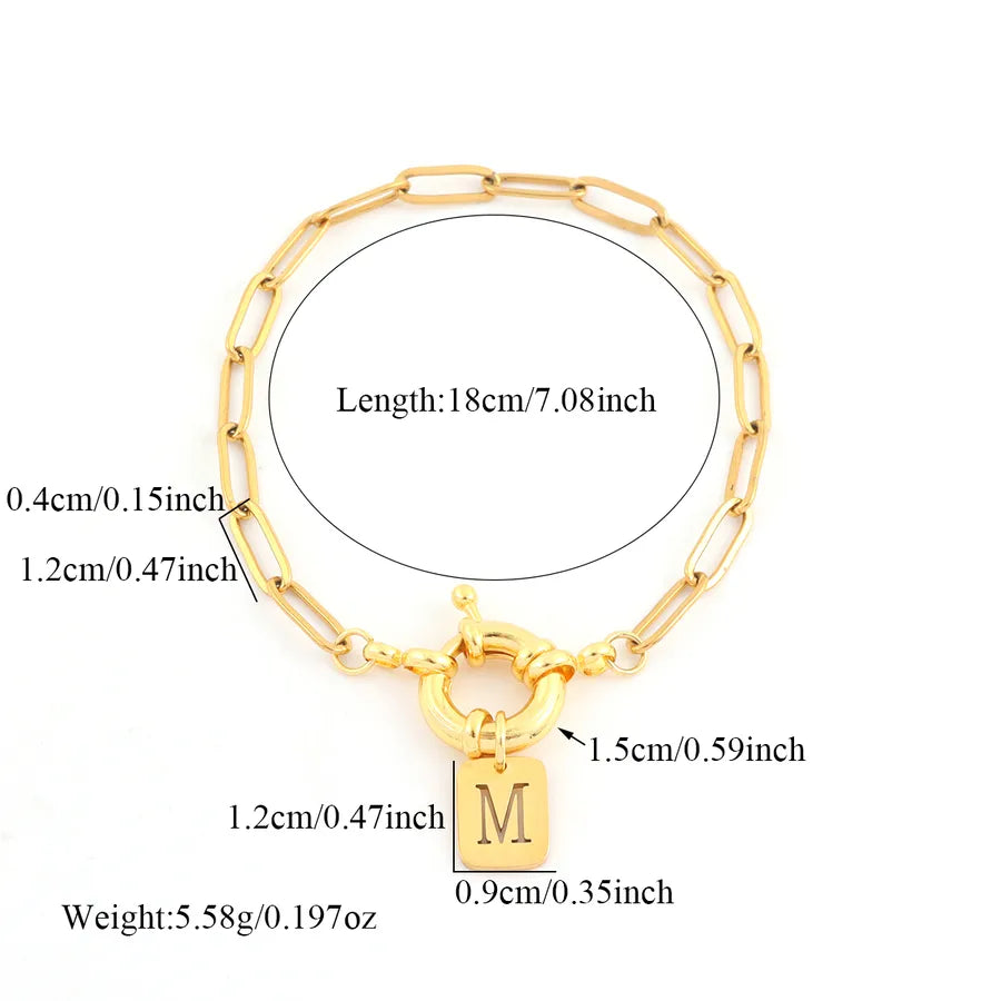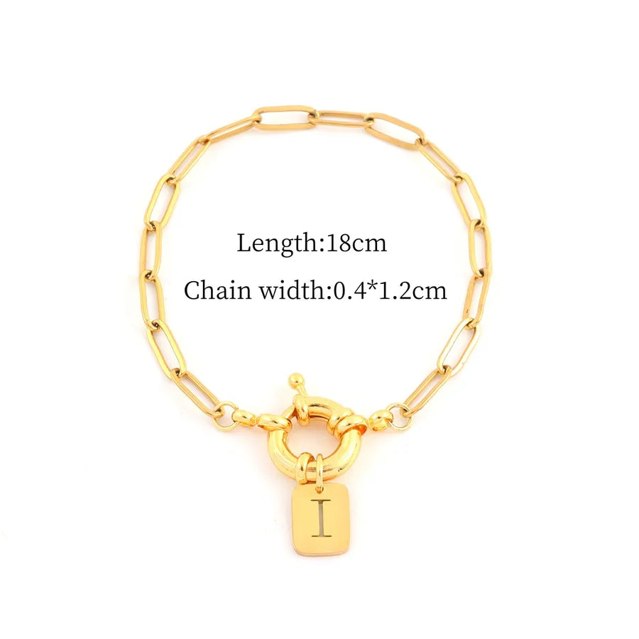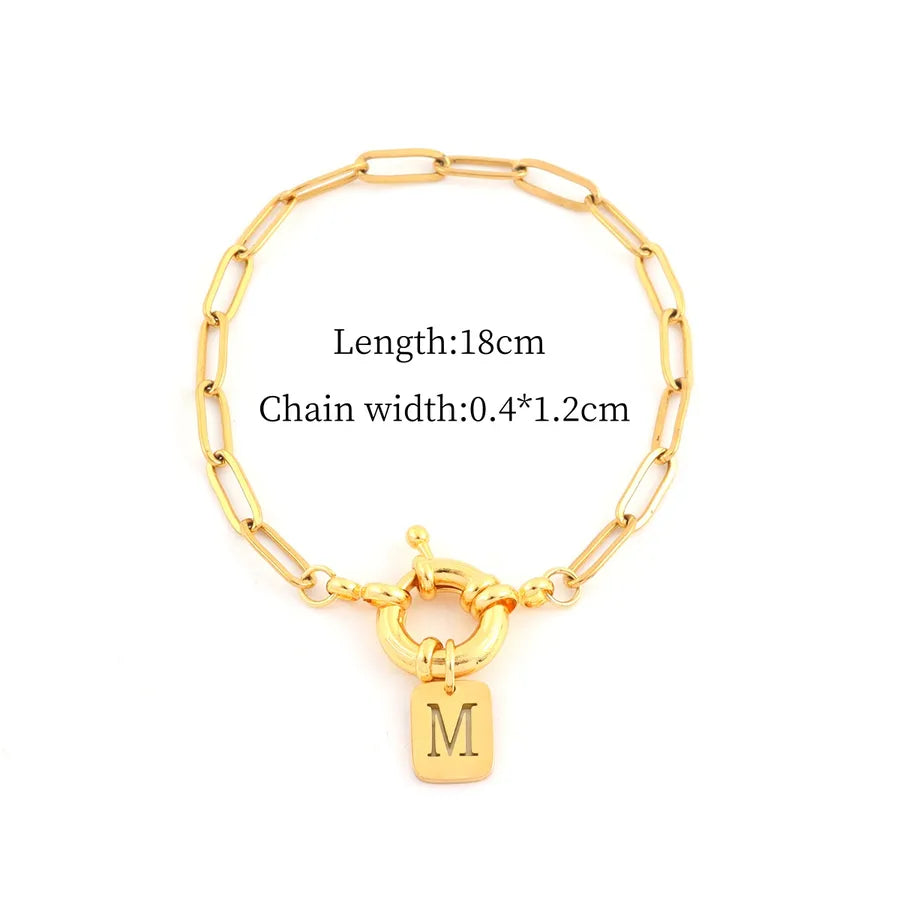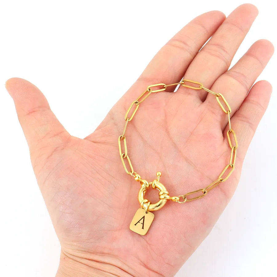 Vacuum Electroplating 18K Real Gold Elegant Fashion Rectangular Hollow Initial Spring Clasp Gold 201 Stainless Steel Paperclip Chain Bracelet for Women