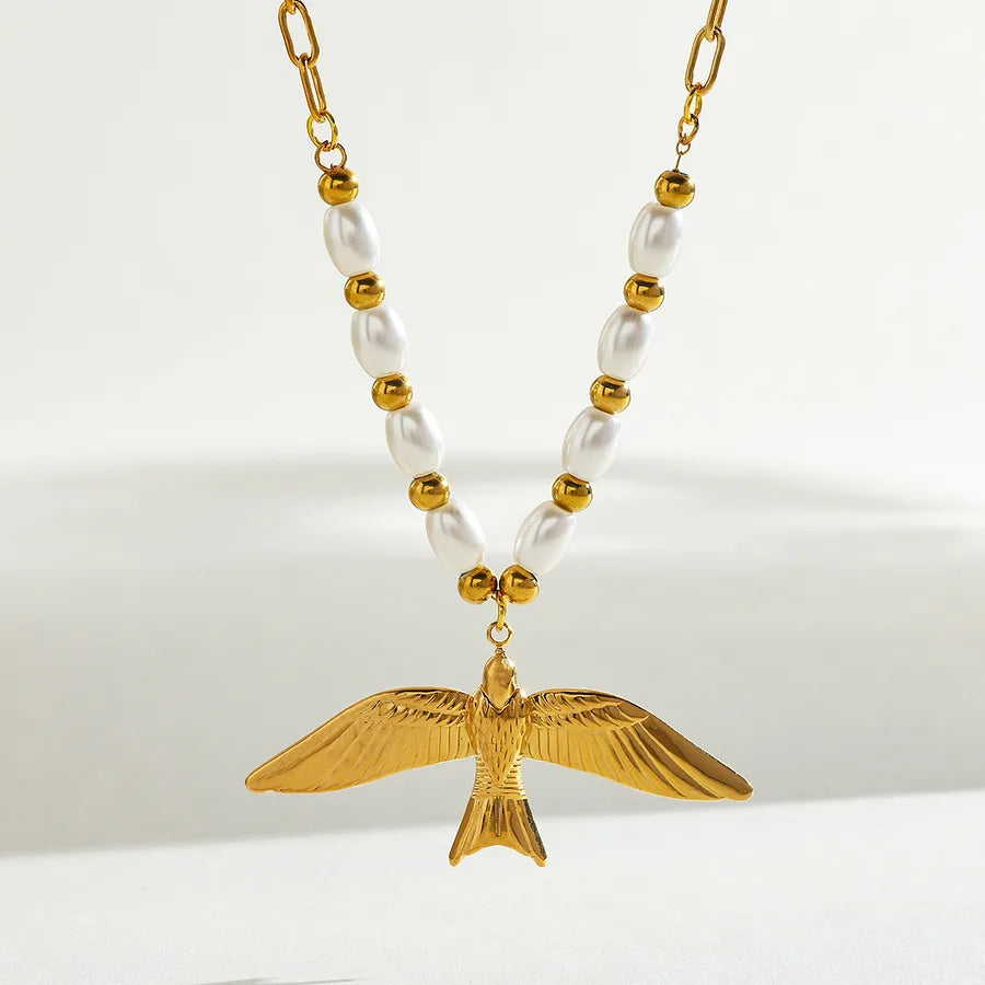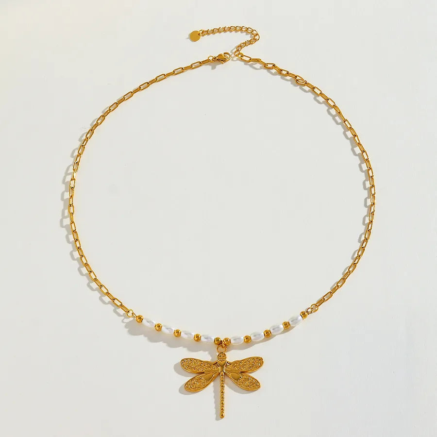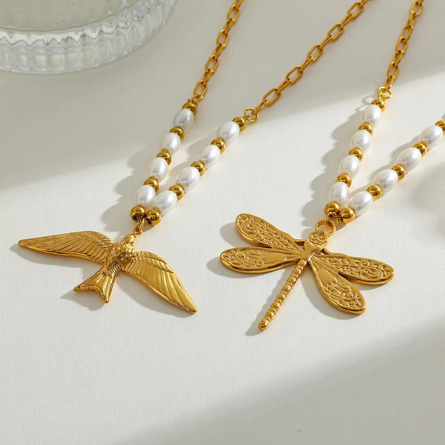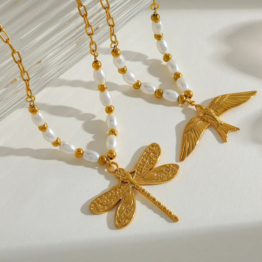 Wholesale Jewelry Casual Elegant Cute Dragonfly Bird 304 Stainless Steel Imitation Pearl 18K Gold Plated PVD Coated Plating Inlay Beaded Chain Paperclip Chain Pendant Necklace