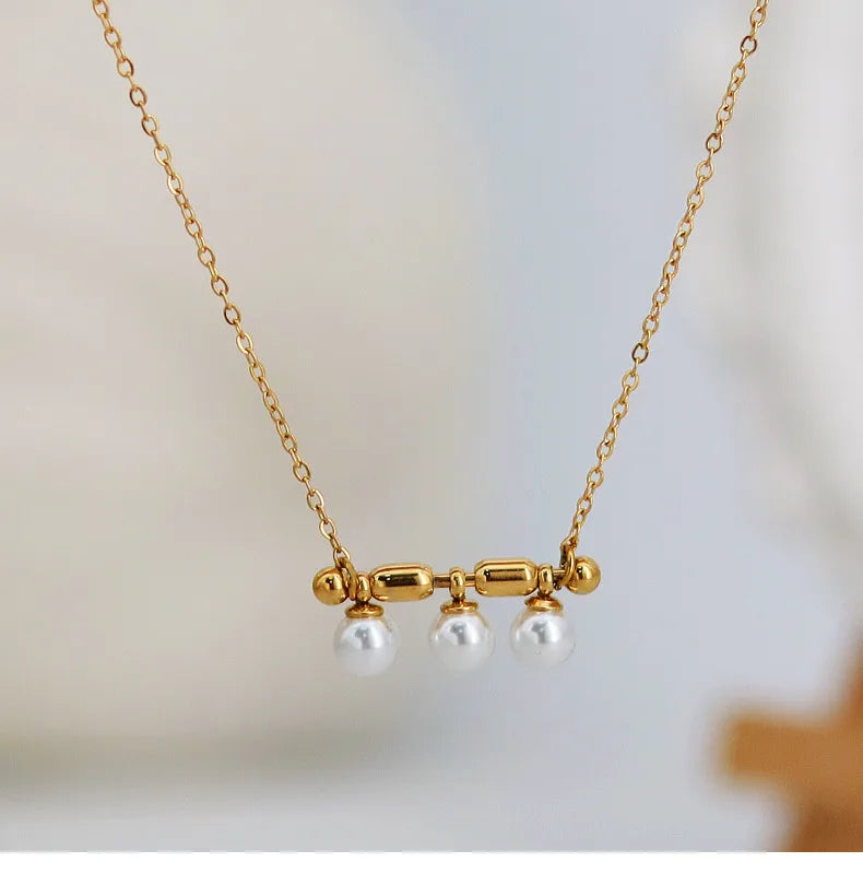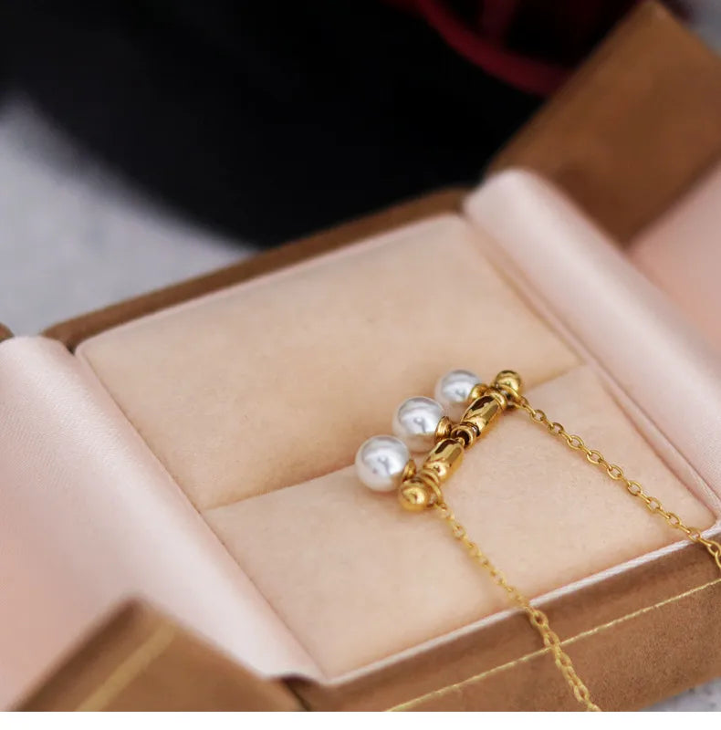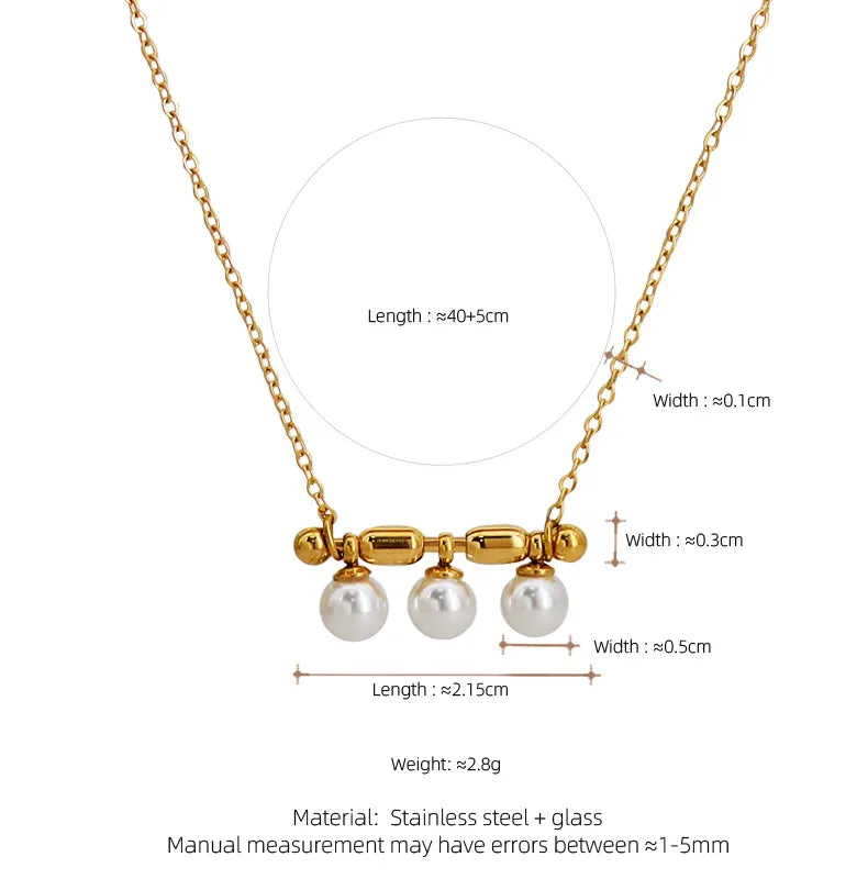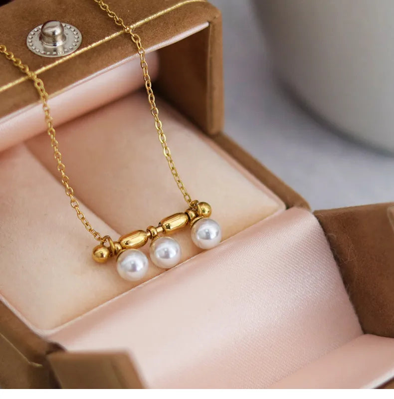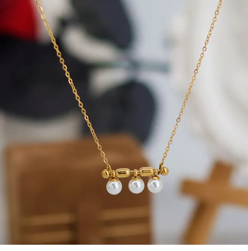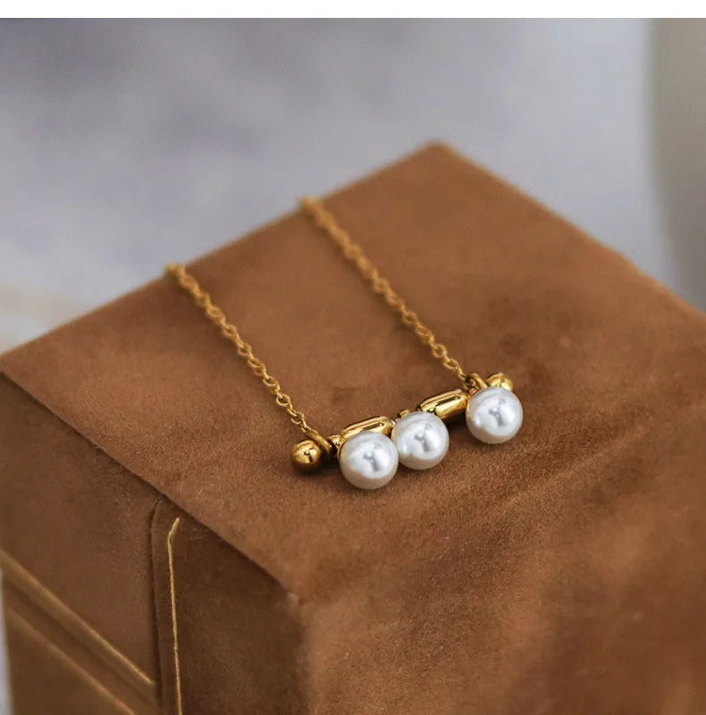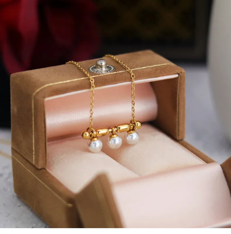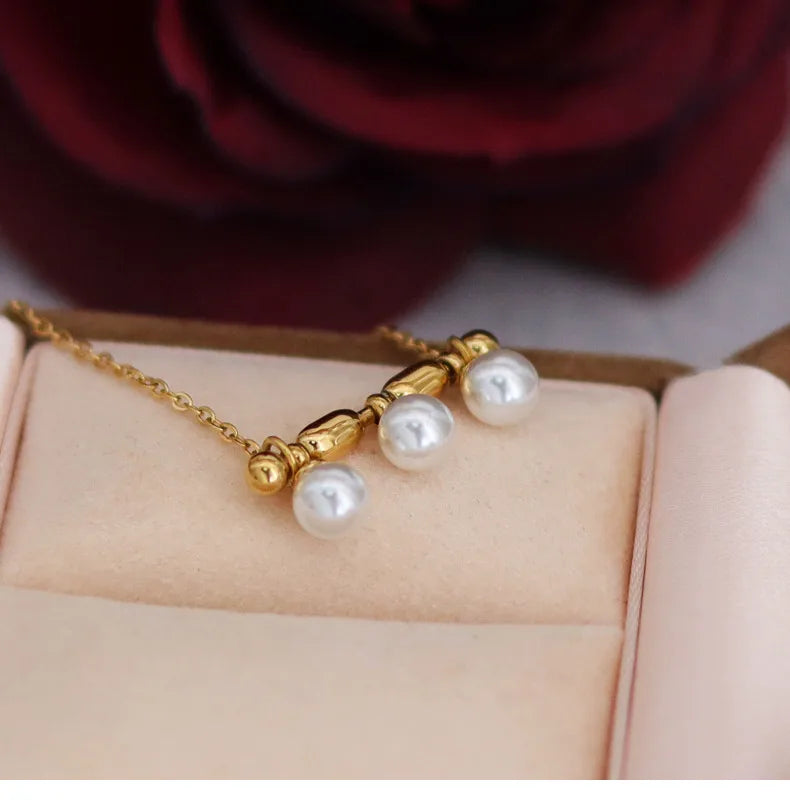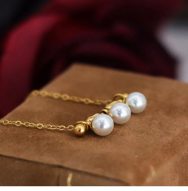 French Triple Pearl Balance Wood Glass Necklace Stainless Steel Note Pendant Clavicle Chain Plated 18K Gold Women's Bracelet