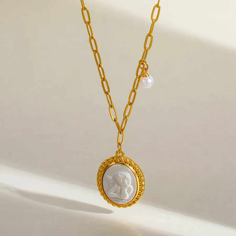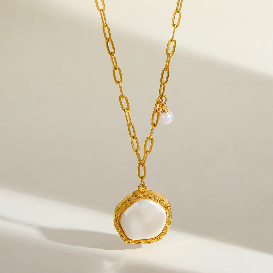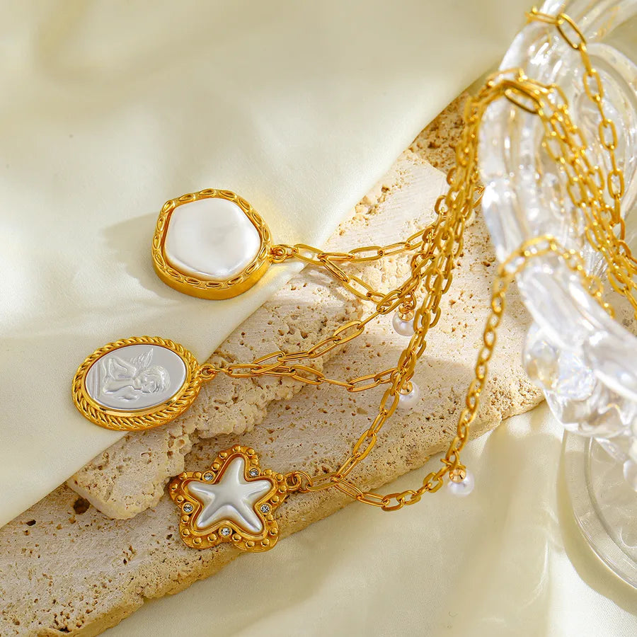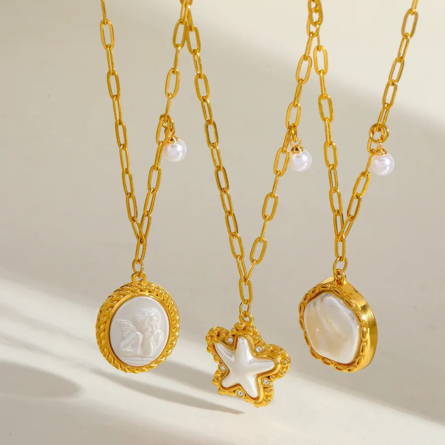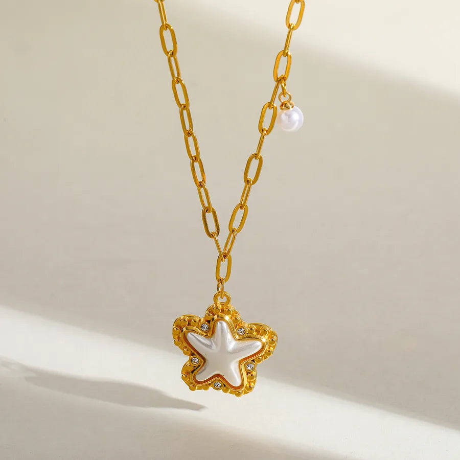 Romantic Elegant Fashion 18K Gold Plated Stainless Steel Pearl Embedded Star Round Pendant Necklace For Women Casual Weekend Date Festival
