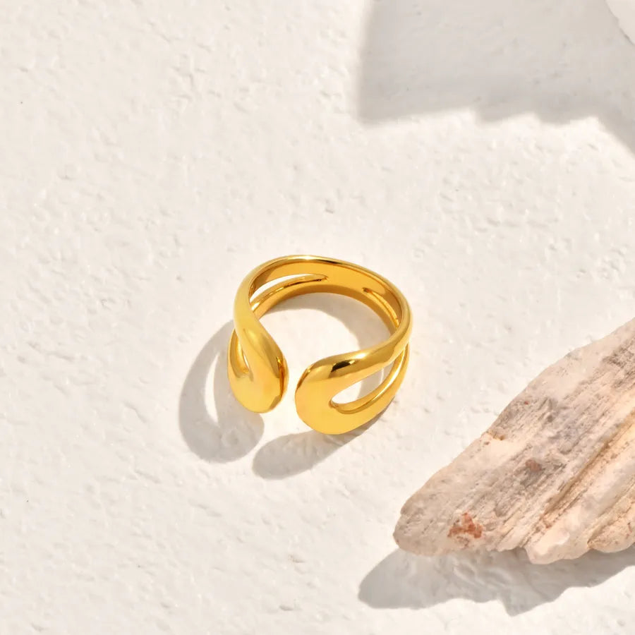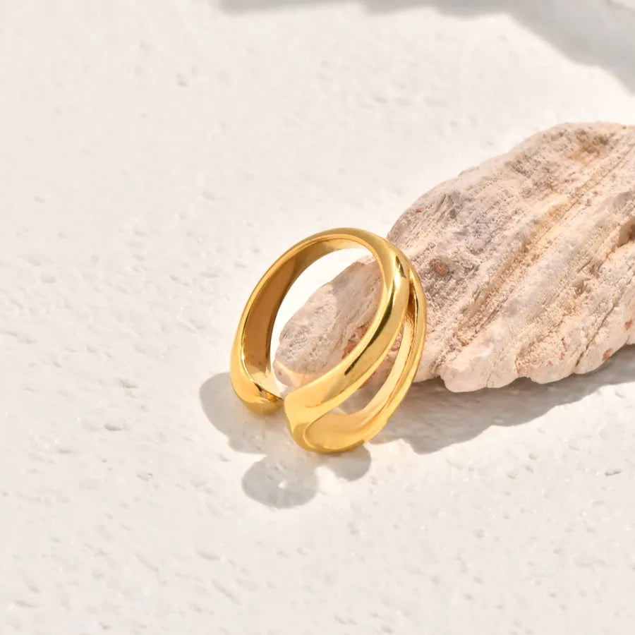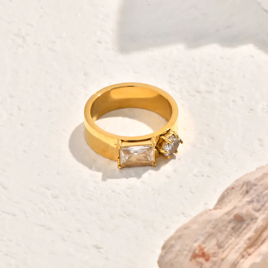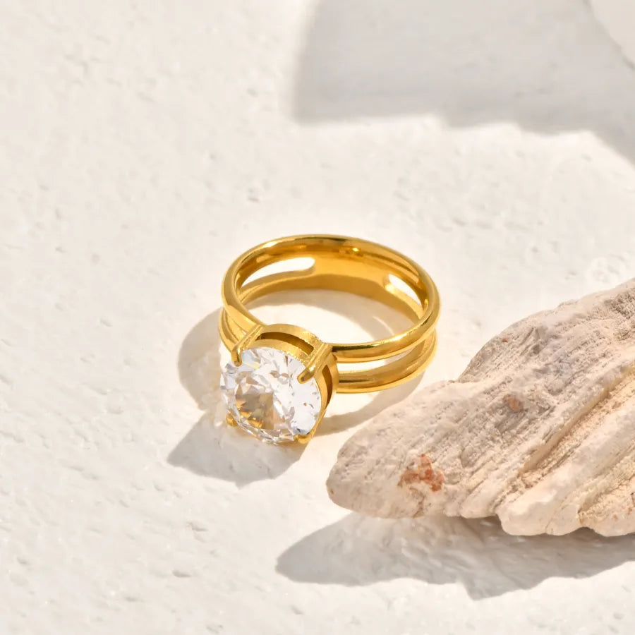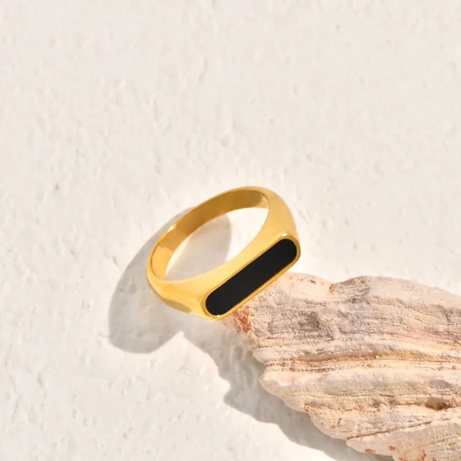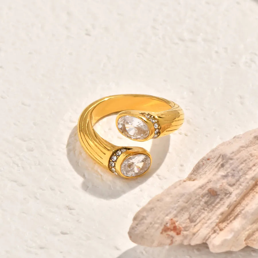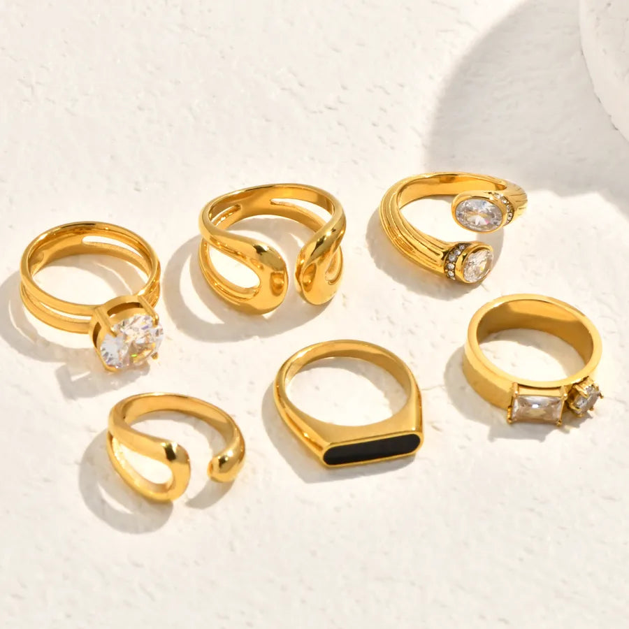 Vintage Black Mother-of-Pearl Double Circle Geometric Fashion Design White Zircon Inlaid Double Stainless Steel 18K Gold Plated Ring